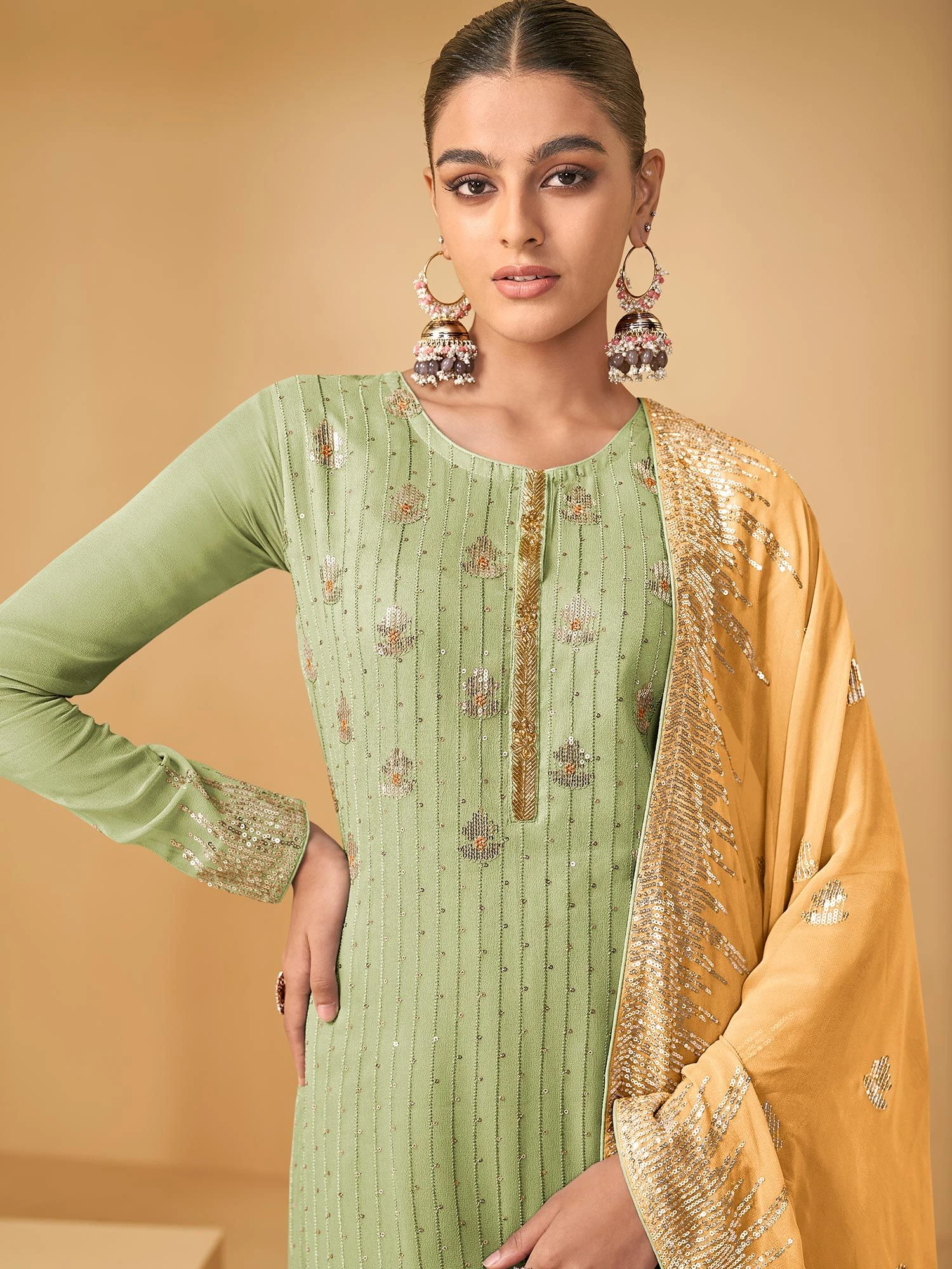 Spread your glizzy charm everywhere wearing this light green blue color straight cut kameez in georgette. Elevated using sequins and thread work embroidery all over. Assembled with a yellow embroidered georgette dupatta and a matching green sharara in georgette. Note: Accessories shown are for styling purpose only. Slight color variation may occur due to photographic reasons. The semi-stitched kameez can be customised upto 42 inches.