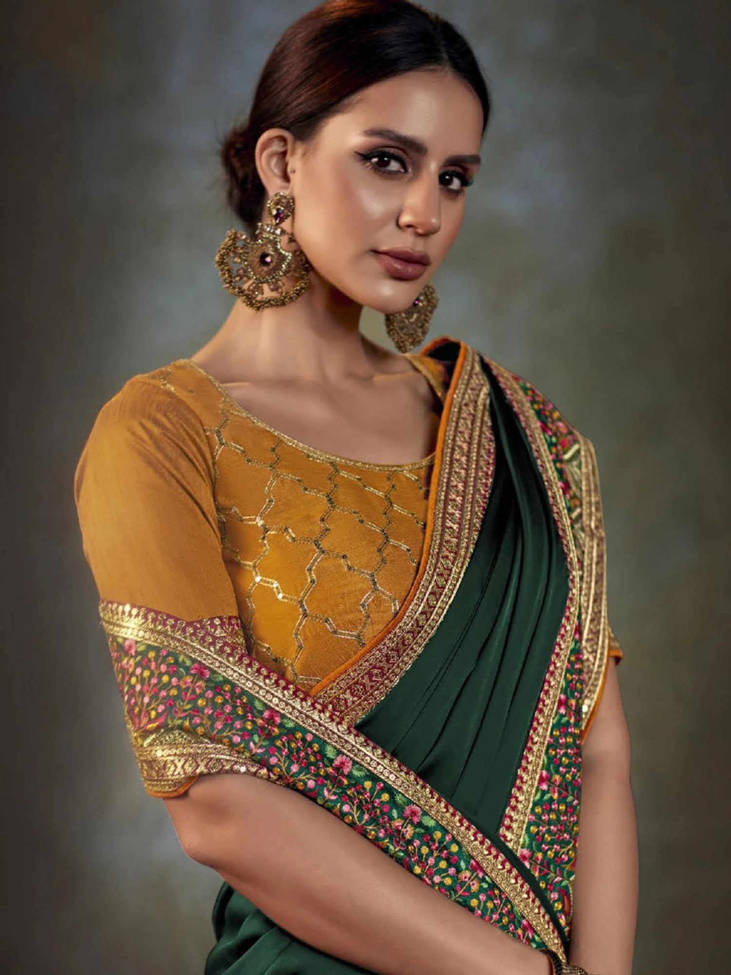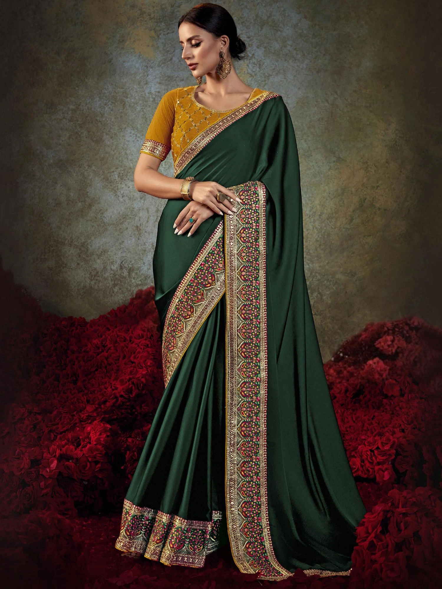 Create symbol of timeless grace and elegance wearing this basil green color saree crafted in art silk. Enhanced using sequins, zari work and embroidered bordered, displaying unique borders and pallu. Comes with a matching mustard yellow color blouse in art silk. Note: The accessories featured are purely for fashion purposes. Due to photography reasons, some color variations may occur. The un-stitched blouse may be customized up to 42 inches.