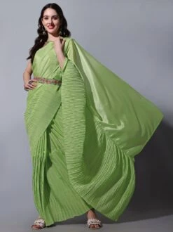 Spread cheer and happiness wearing this lush green color saree crafted in crepe. Decorated using crushed pleated patterns. Paired with a matching green color embroidered blouse in crepe. Note: The accessories featured are purely for fashion purposes. Due to photography reasons, some color variations may occur. The un-stitched blouse may be customized up to 42 inches.