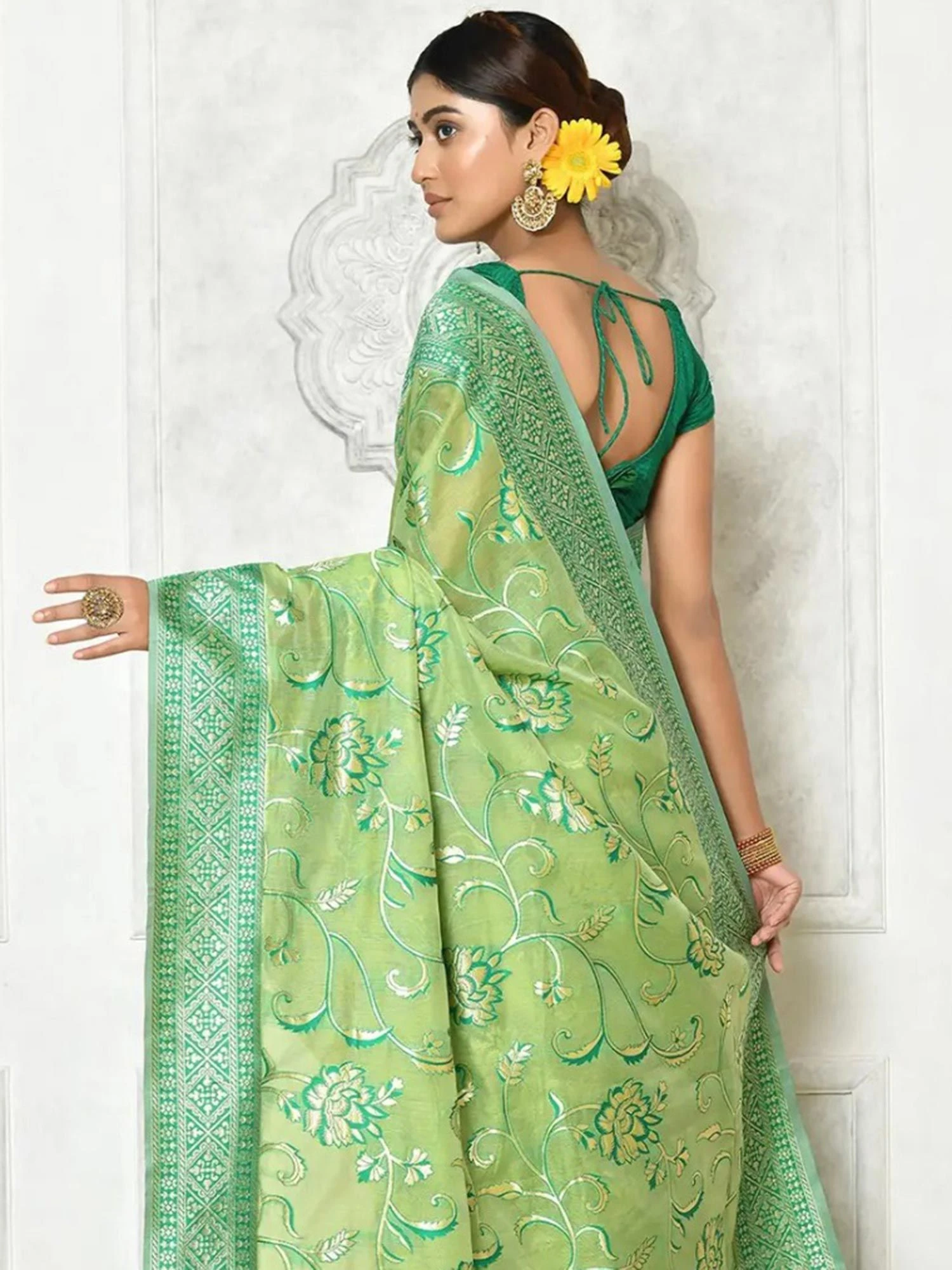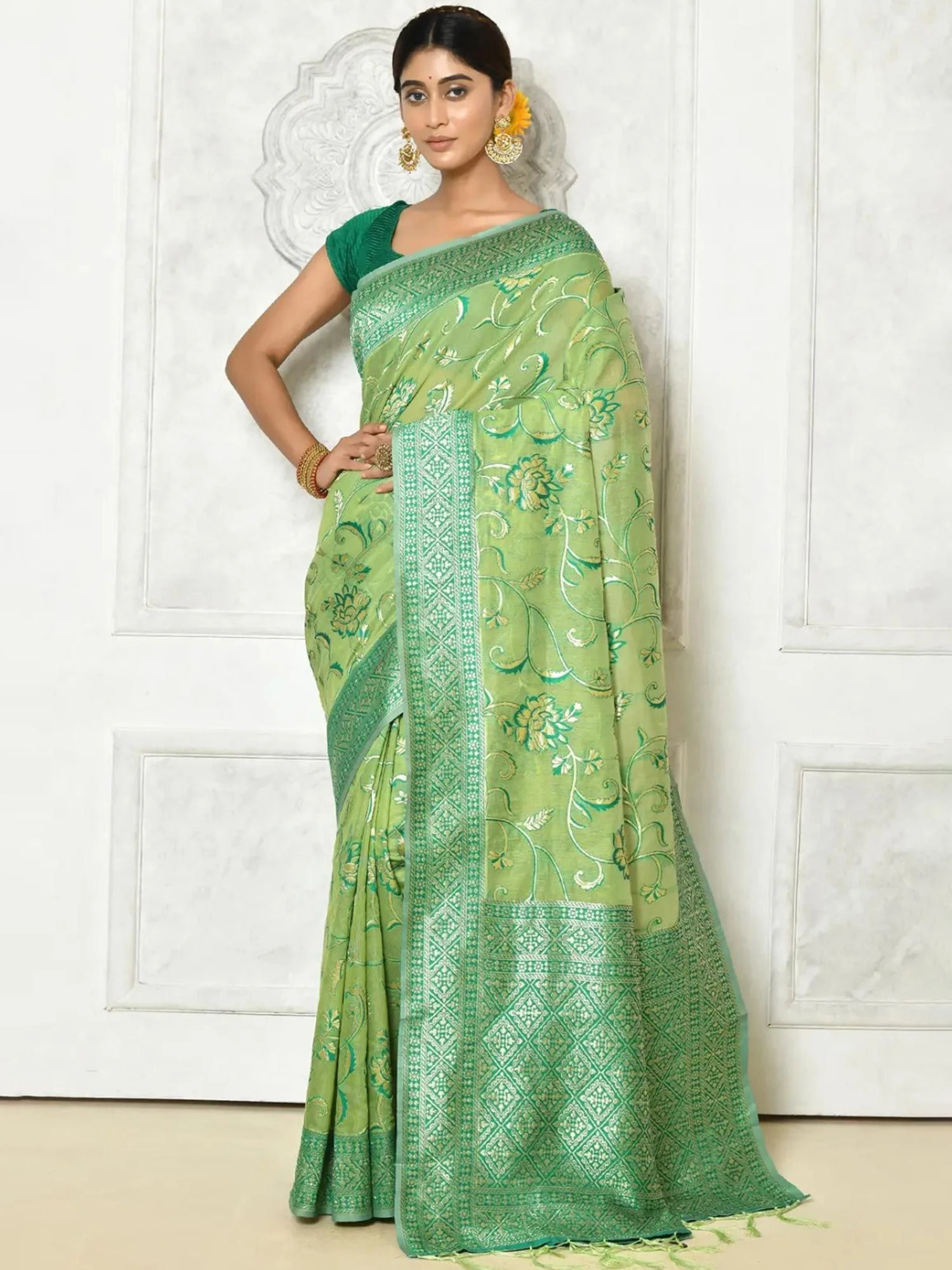 Make a stately statement wearing this green color saree crafted in cotton. Furnished using zari woven floral patterns, showcasing distinstive borders and pallu. Comes with a matching green color blouse in cotton. Note: The accessories featured are purely for fashion purposes. Due to photography reasons, some color variations may occur. The un-stitched blouse may be customized up to 42 inches.