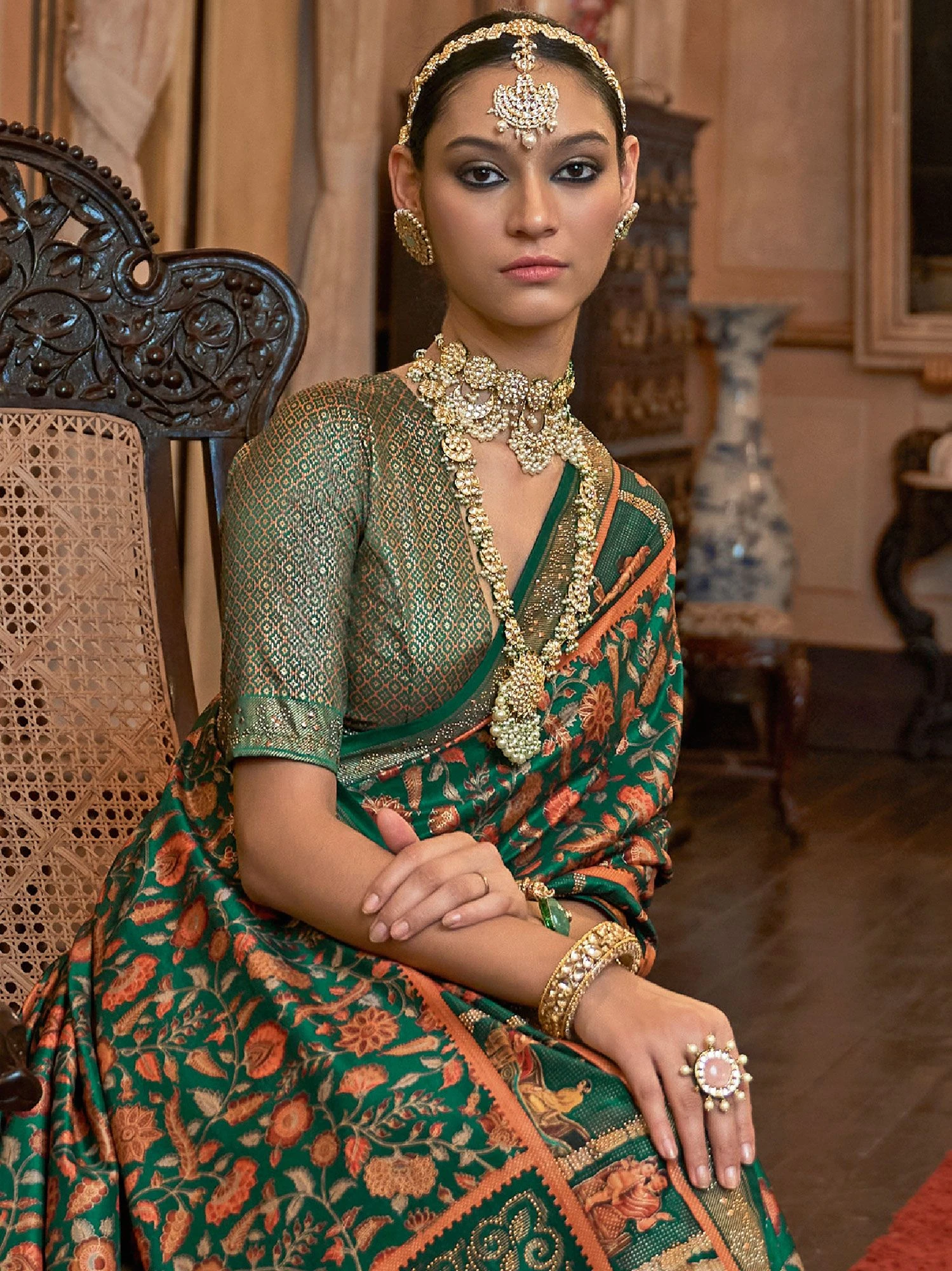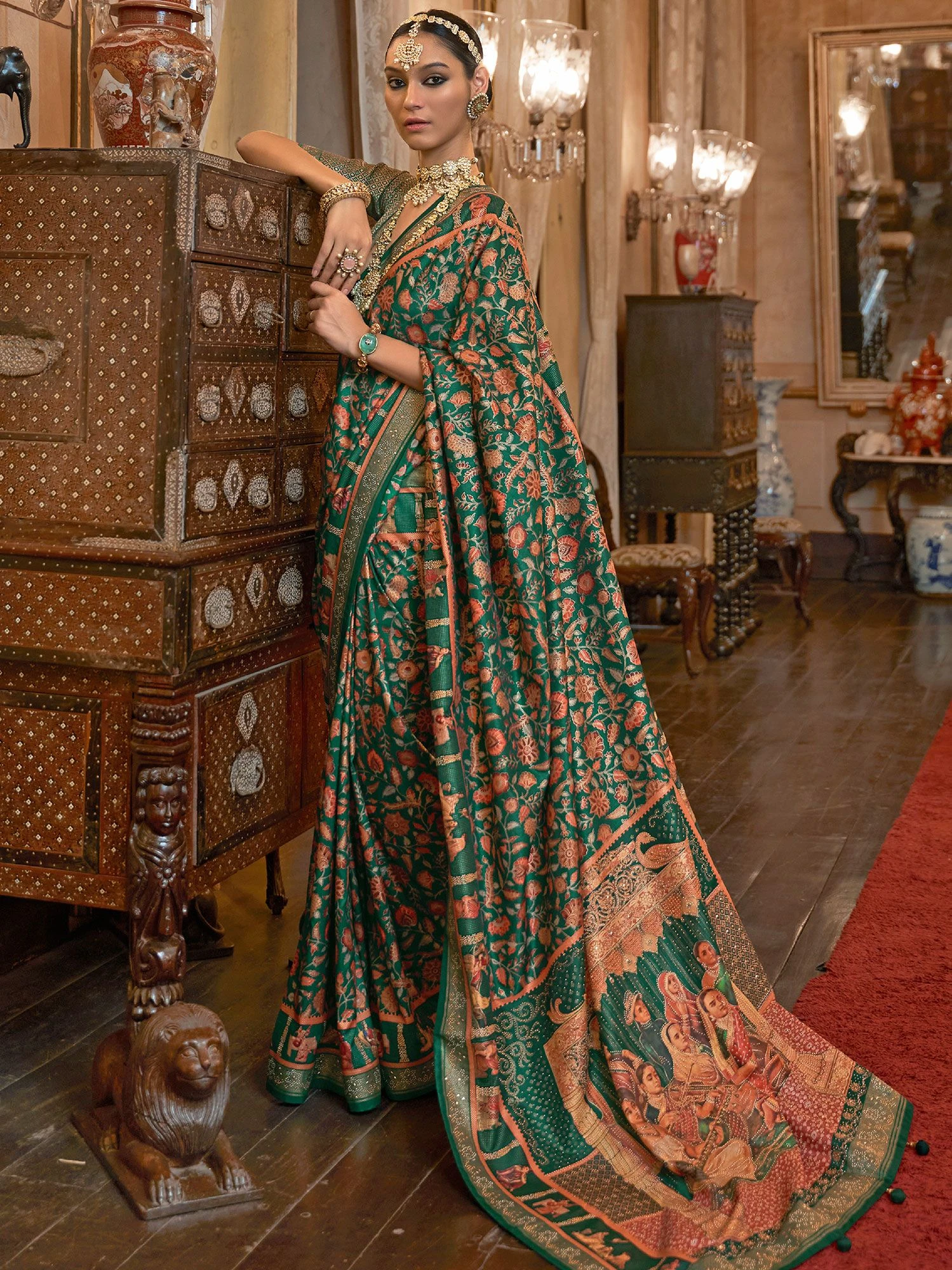 Grab all the compliments as you wear this green color saree crafted in patola silk. Furnished using floral printed patola patterns all over, stones, zari woven designs showcasing distinstive borders and pallu. Assembled with a matching green color blouse in silk. Note: The accessories featured are purely for fashion purposes. Due to photography reasons, some color variations may occur. The un-stitched blouse may be customized up to 42 inches.