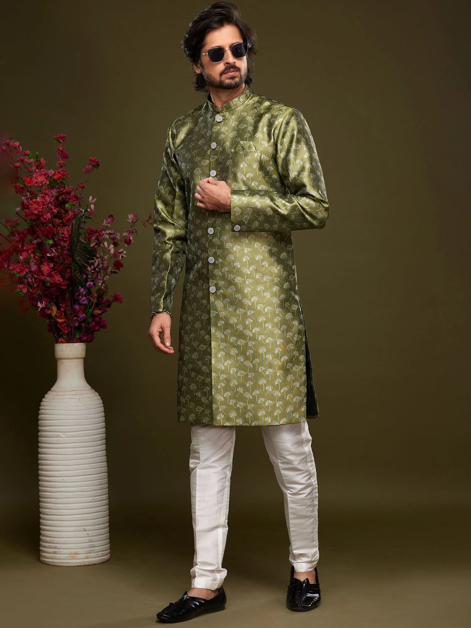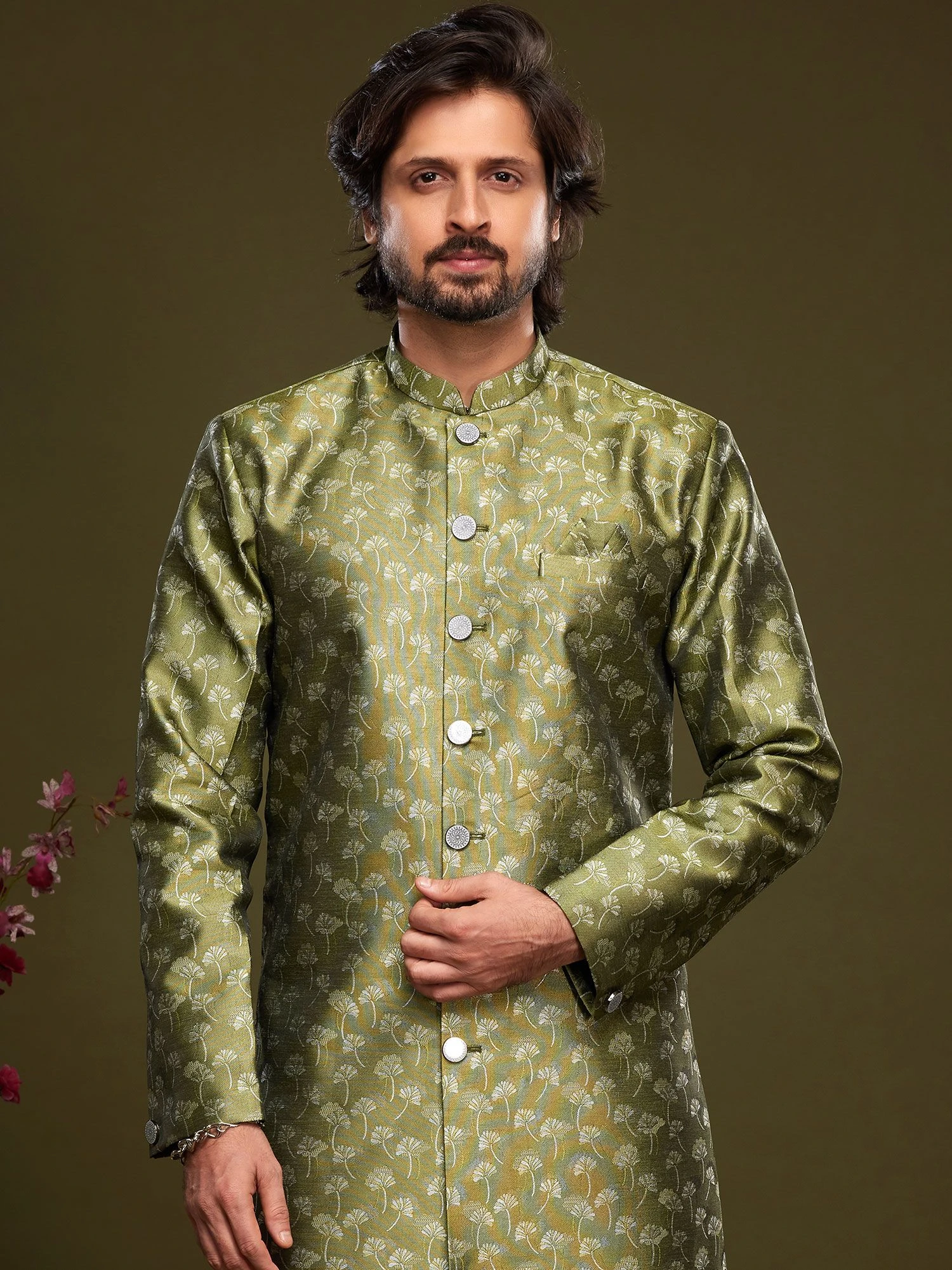 Step into the world with timeless elegance adorning this metallic green color indo western made in banarasi silk. Decorated using jacqaurd woven work with buttoned up front. Assembled with white color trousers in dupion silk. Note: Some color variations may occur owing to photography causes. Up to 1 inch of measurement fluctuation is possible.