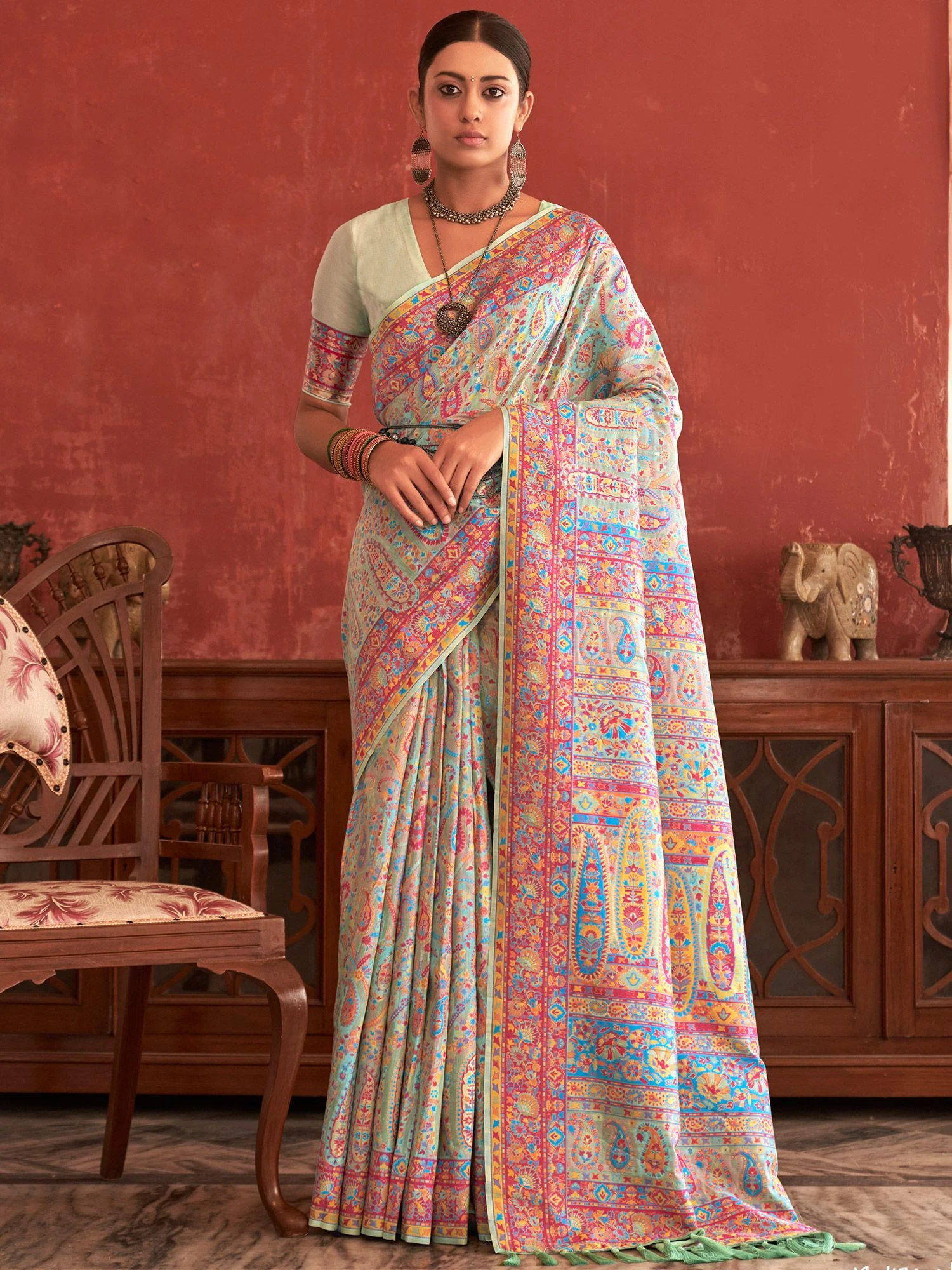 Addressing the Glamour while having this sea green color saree made in pashmina silk. Elevated using floral woven patterns all over with tasseled pallu. Comes with a matching sea green color blouse in pashmina silk. Note: The accessories featured are purely for fashion purposes. Due to photography reasons, some color variations may occur. The un-stitched blouse may be customized up to 42 inches.