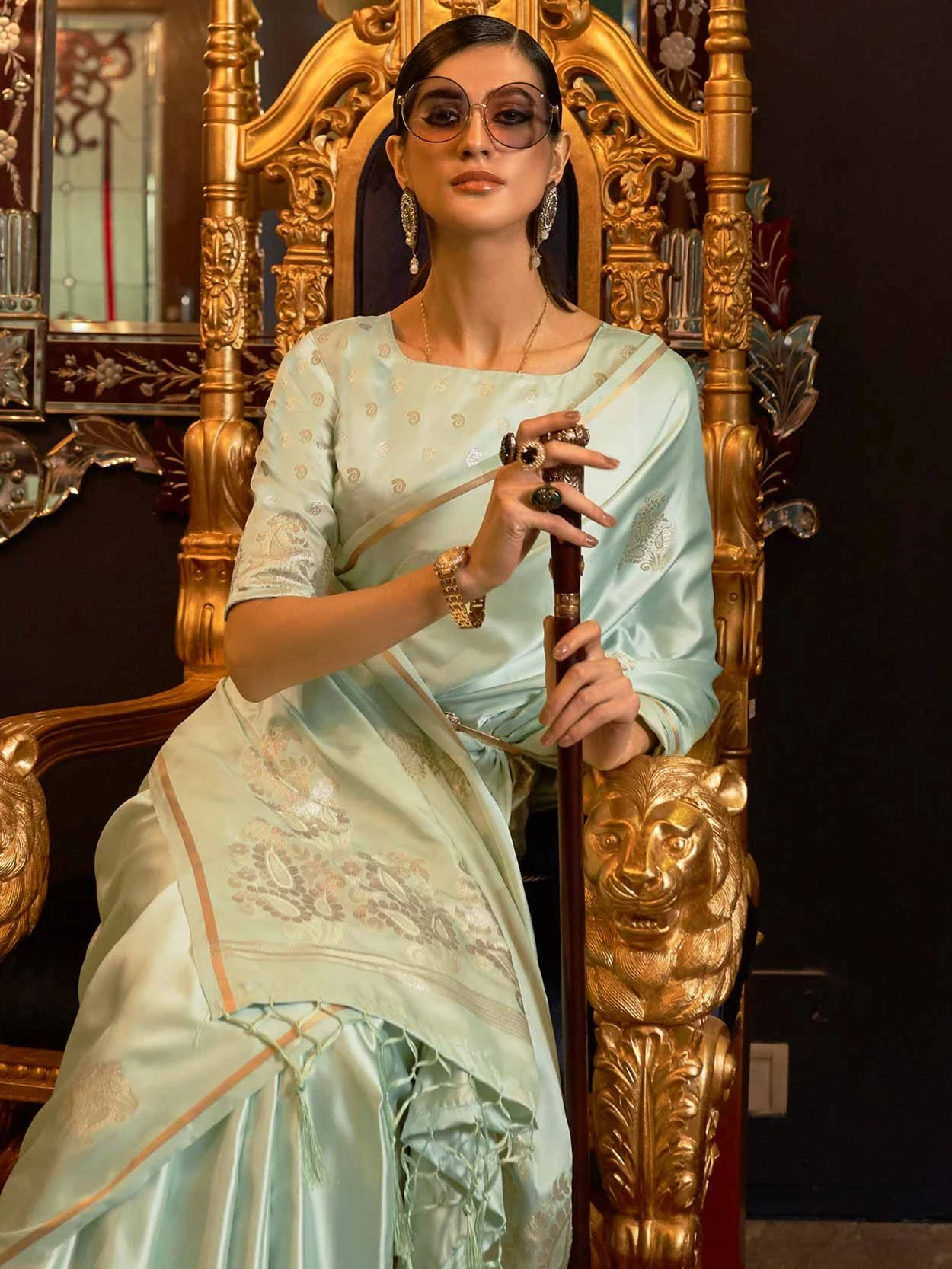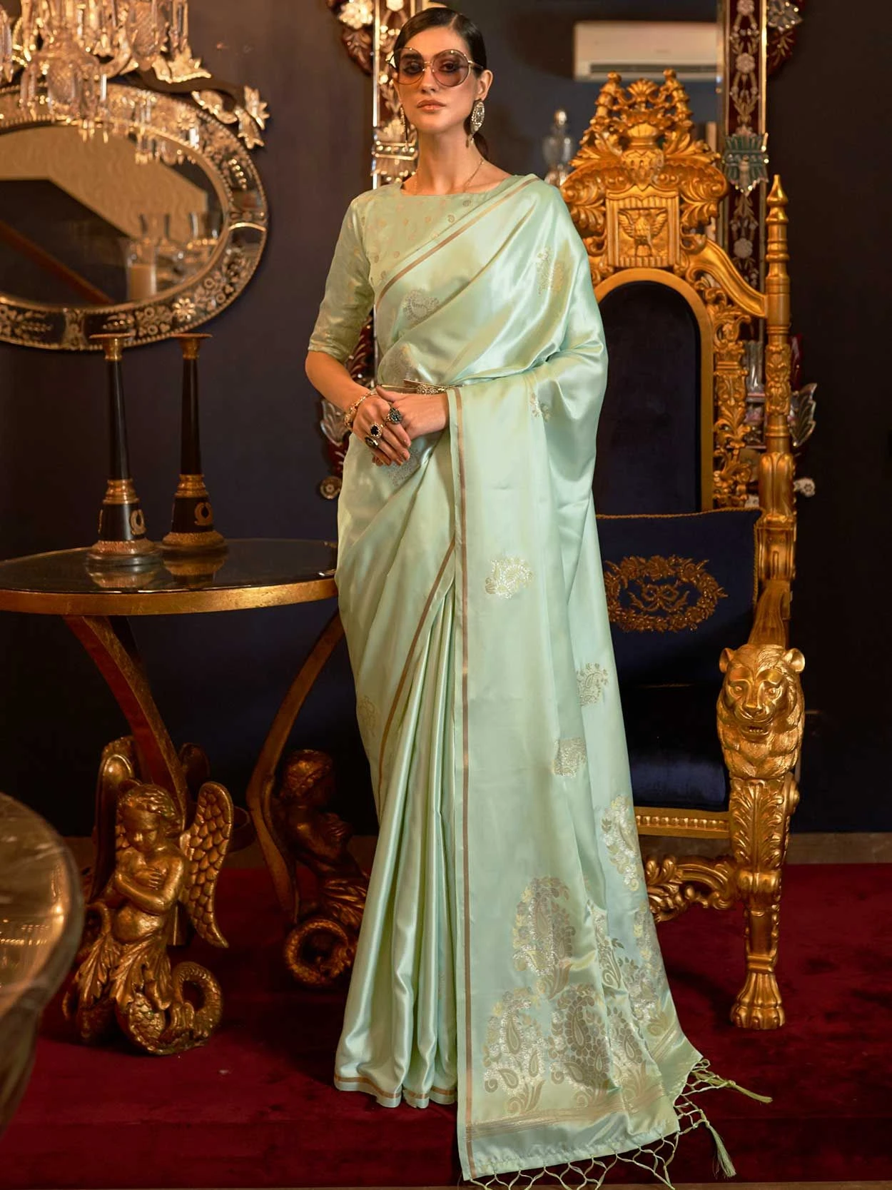 Exude major dreamy vibes donning in this light green color festive saree crafted in satin. Designed using floral themed zari woven patterns, showcasing distinstive pallu. Comes with a matching green color blouse in satin. Please keep in mind that the accessories featured are purely for fashion purposes. Due to photography reasons, some color variations may occur. The un-stitched blouse may be customized up to 42 inches.