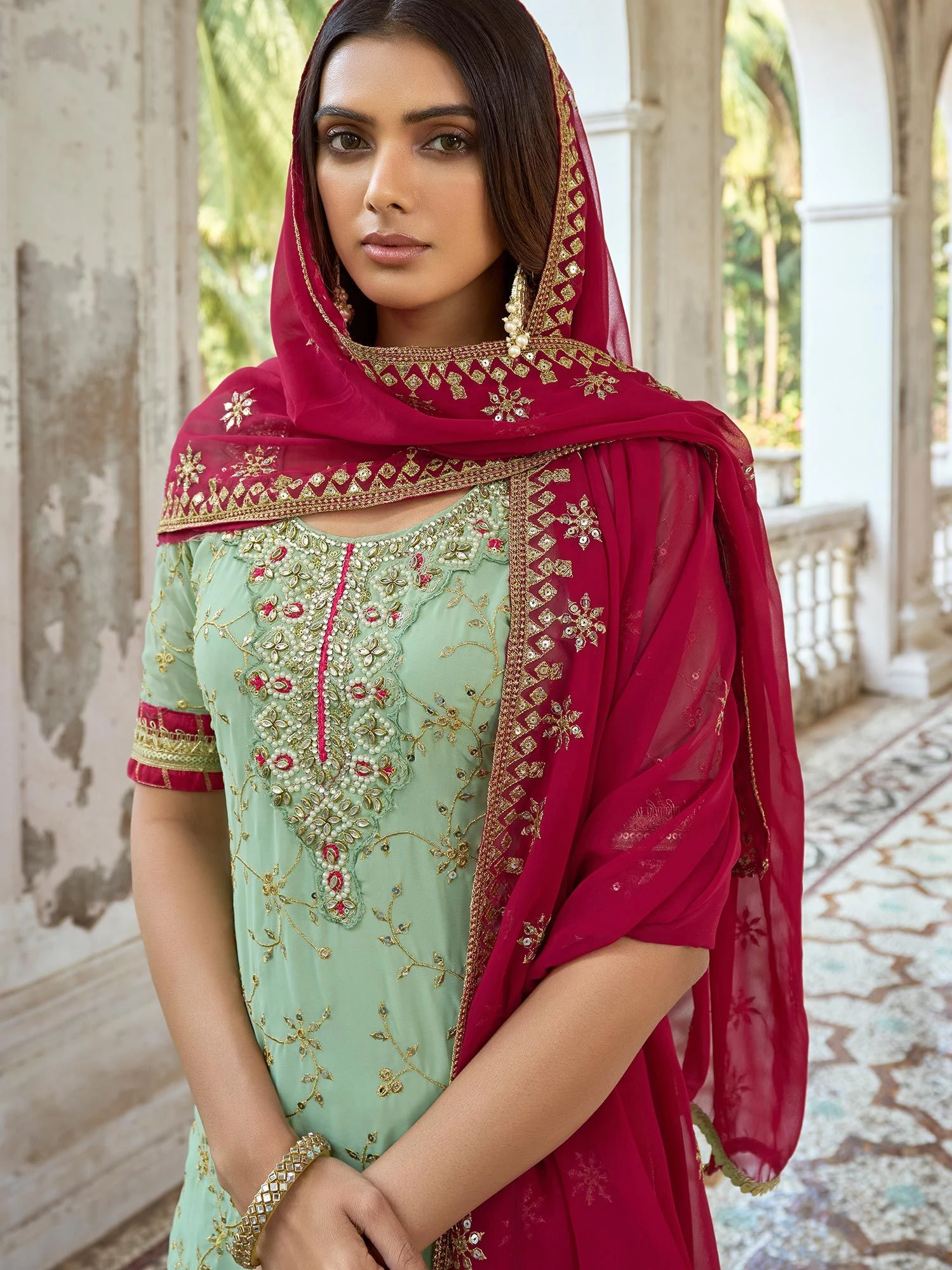 Wrap yourself in sunshine adorning this soft green color flared kameez in georgette. Enhanced using zari, sequins and threads embroidery work all over with heavy hand embroidered neckline. Paired with a pink embroidered dupatta and a matching embroidered palazzo, both made in georgette. Note: Accessories shown are for styling purpose only. Slight color variation may occur due to photographic reasons. The semi-stitched kameez can be customised upto 42 inches.