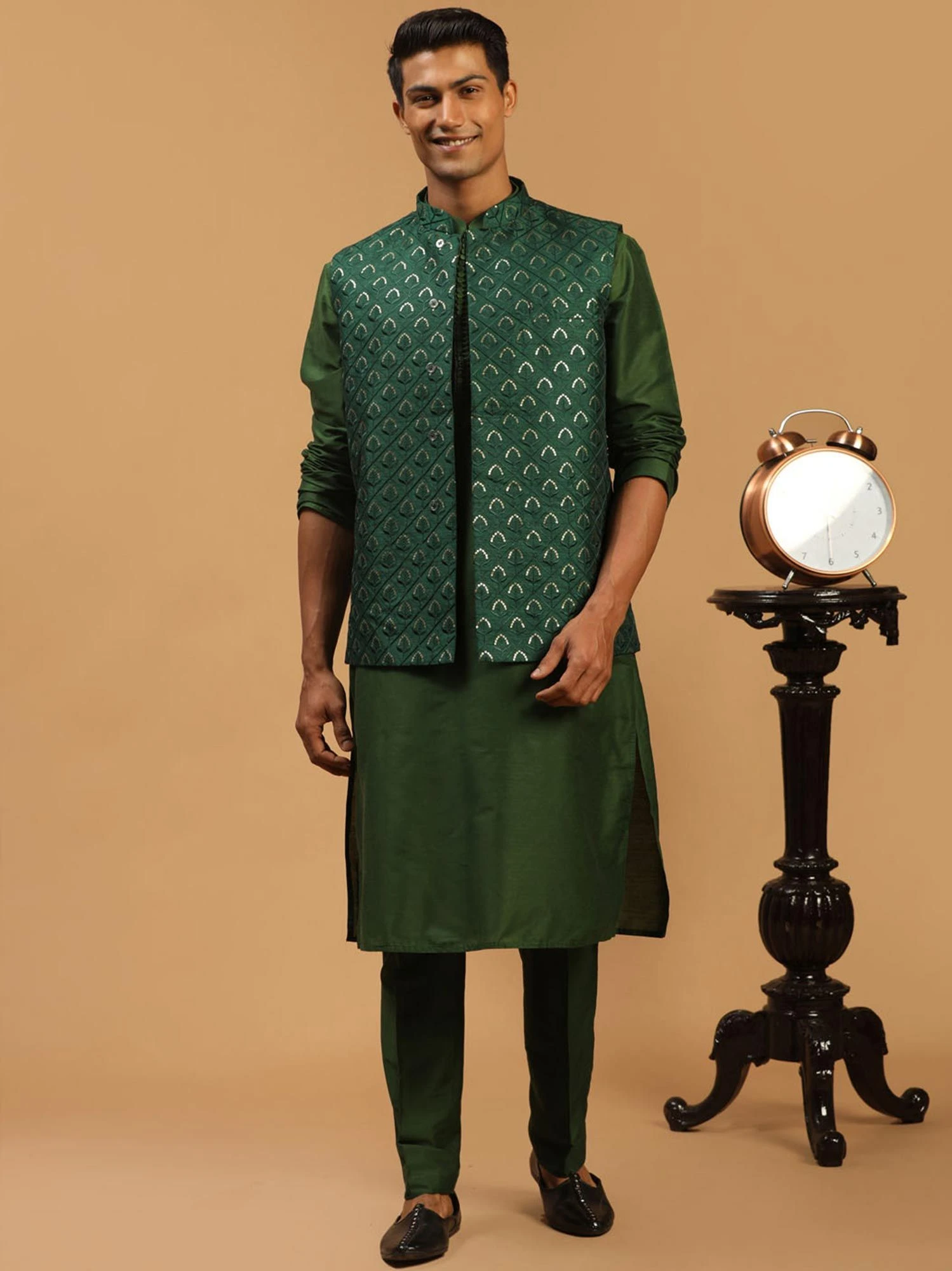 Switch on your elegant mode adorning this lush green color kurta made in art silk. Assembled with a green art silk nehru jacket enriched with sequins embroidered details. Paired with a green color trouser pants in art silk. Note: Some color variations may occur owing to photography causes. Up to 1 inch of measurement fluctuation is possible.