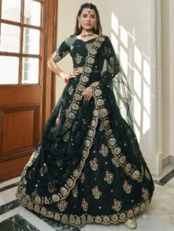 Spread your charm everywhere wearing this dark green color lehenga in organza. Decorated with sequins, zari and thread work. Paired with a embroidered blouse in organza and net dupatta, both made in green color. Note: The accessories featured are purely for fashion purposes. Due to photography reasons, some color variations may occur. The semi-stitched choli and lehenga waist may be customized up to 42 inches.