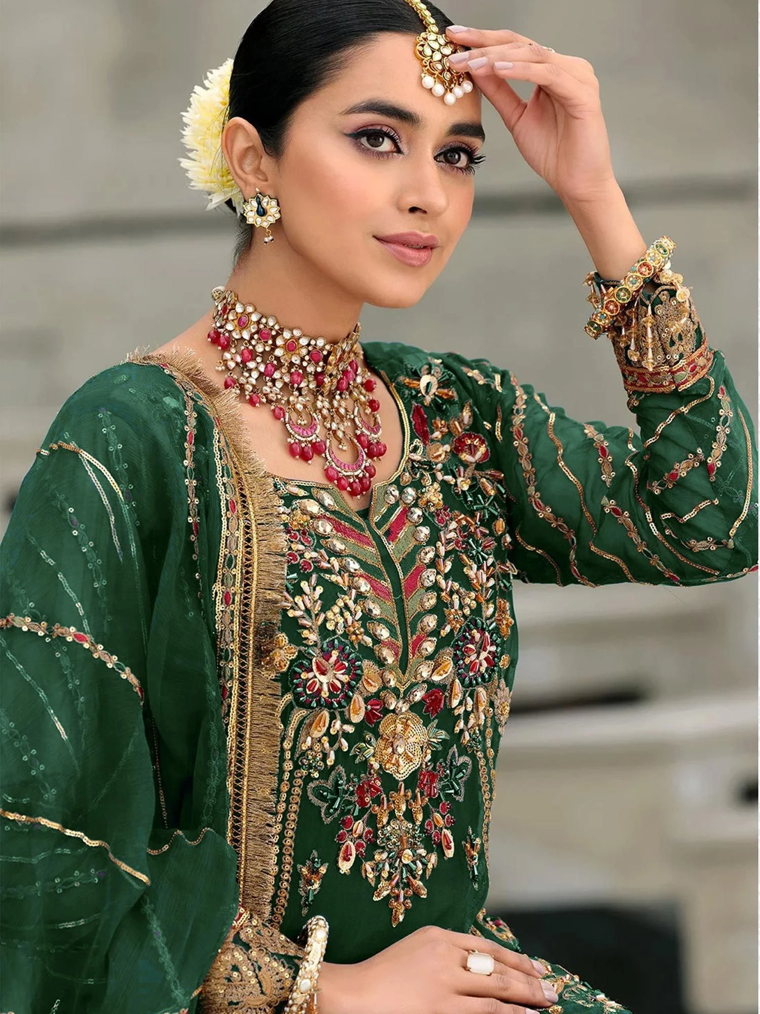 Overwhelm the audience adorning this deep green color straight cut kameez in georgette. Decorated using sequins, stones, zari and thread work embroidery all over. Paired with a green chiffon dupatta with embroidery and matching pants in shantoon. Note: Accessories shown are for styling purpose only. Slight color variation may occur due to photographic reasons. The semi-stitched kameez can be customised upto 42 inches.