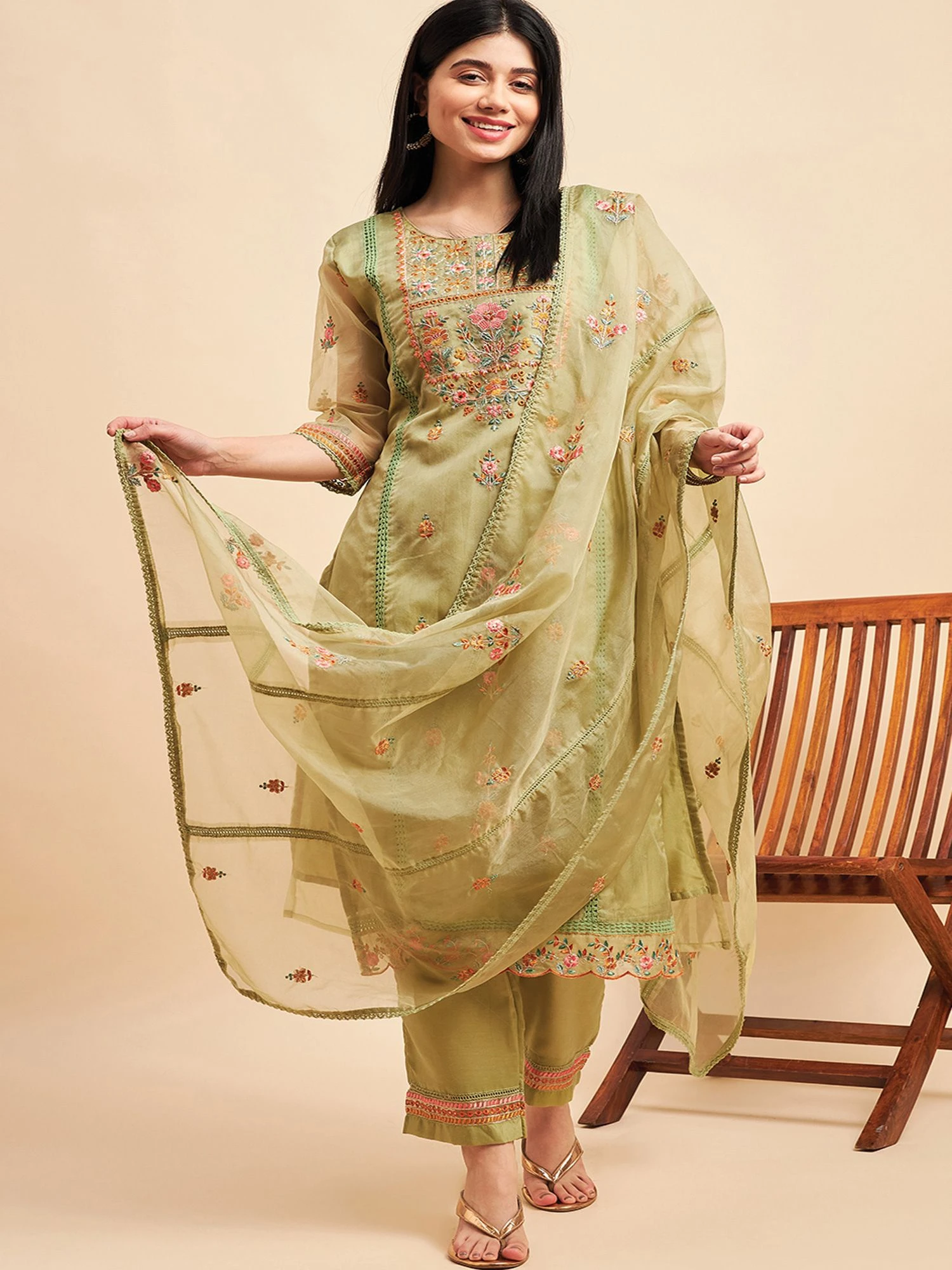 Enhance yourself with this olive green color straight cut kameez in organza. Crafted using floral thread embroidered. Teamed with a organza dupatta and a pant style bottom, both made in green color. Note: Accessories shown are for styling purpose only. Slight color variation may occur due to photographic reasons. The semi-stitched kameez can be customised upto 42 inches.