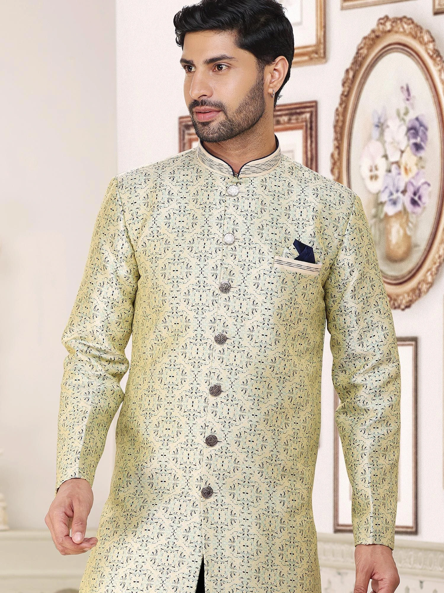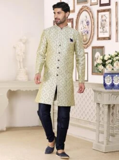 Look all stylish wearing this light green color kurta made in jacquard. Elevated using printed patterns all over with embroidery along the edges. Teamed with a blue color churidaar pants in dupion silk. Note: Some color variations may occur owing to photography causes. Up to 1 inch of measurement fluctuation is possible.