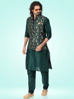 Elevate your festive closet with this green color kurta made in art silk. Enhanced using jacquard woven banarasi silk jacket in green shade. Assembled with matching green color churidaar in art silk. Note: Some color variations may occur owing to photography causes. Up to 1 inch of measurement fluctuation is possible.