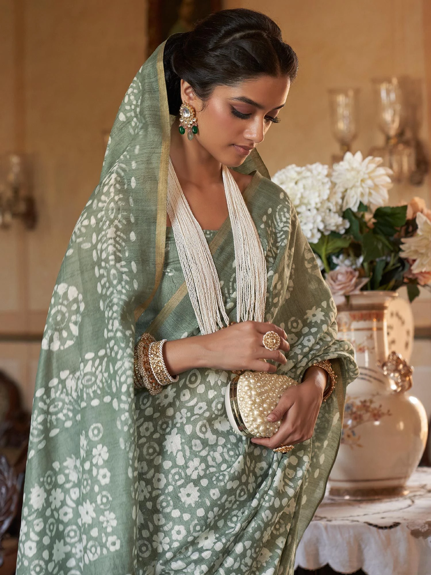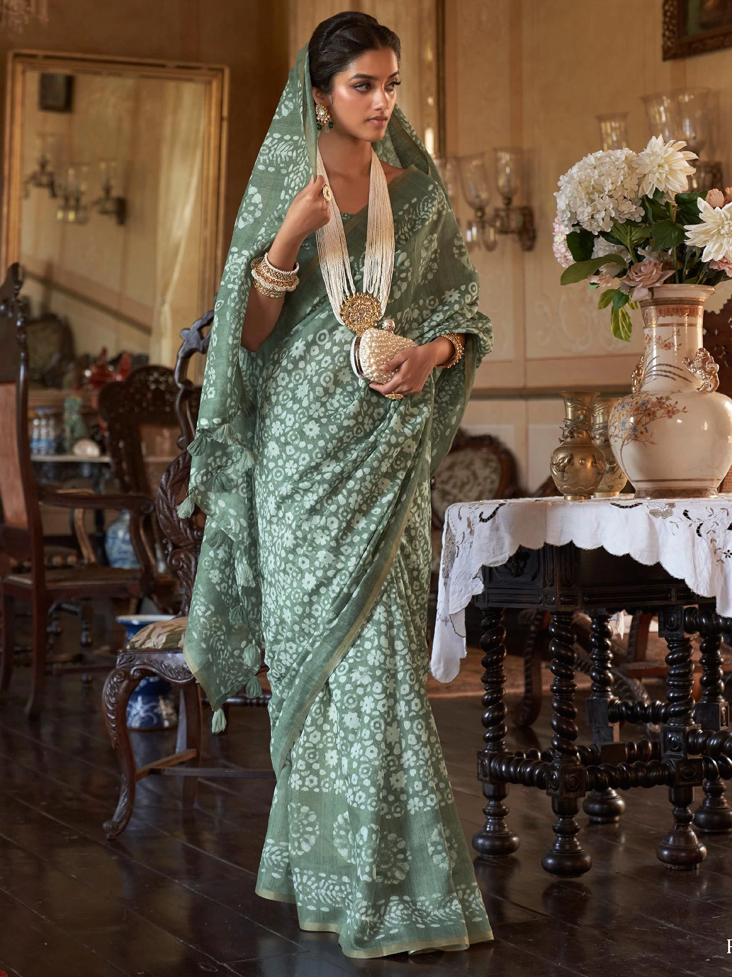 Shine brighter all day wearing this green color saree crafted in cotton. Designed using printed patterns all over. Comes with a matching green color blouse in cotton. Note: The accessories featured are purely for fashion purposes. Due to photography reasons, some color variations may occur. The un-stitched blouse may be customized up to 42 inches.