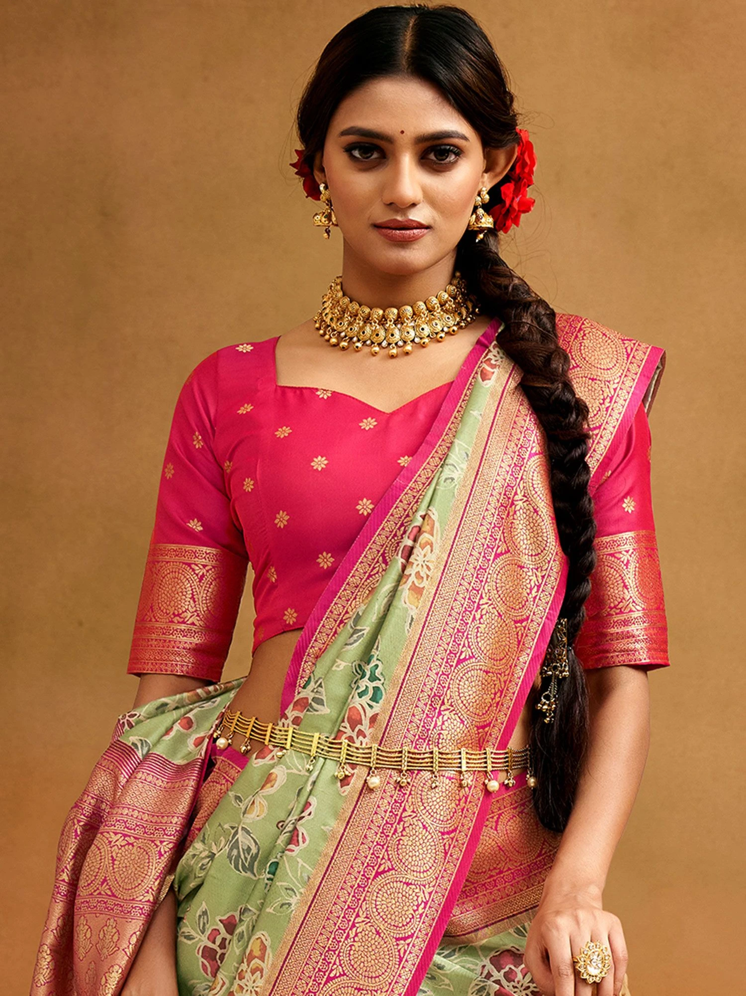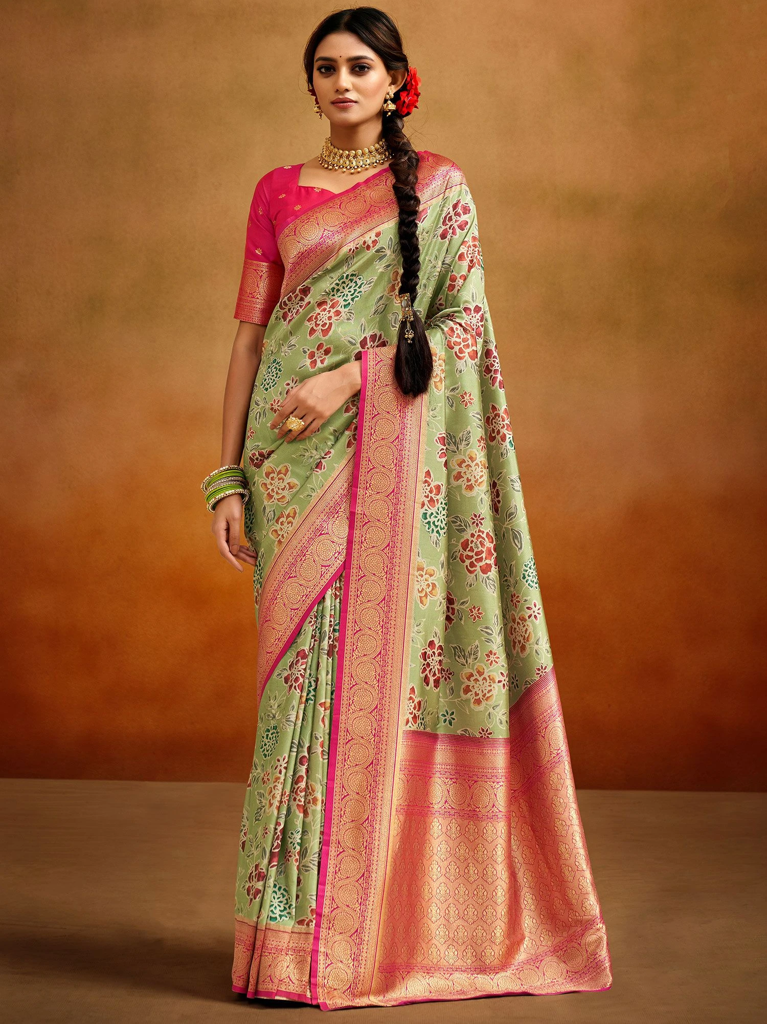 Exude major regal vibes adorning this olive green color saree crafted in silk. Furnished using floral printed patterns and exhibiting unique zari woven borders and pallu. Comes with a matching pink color blouse in silk. Note: The accessories featured are purely for fashion purposes. Due to photography reasons, some color variations may occur. The un-stitched blouse may be customized up to 42 inches.