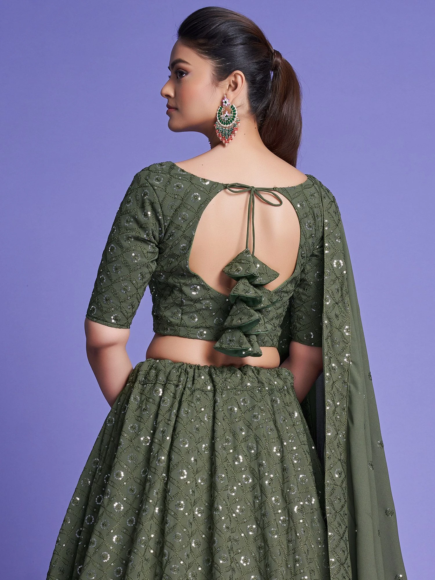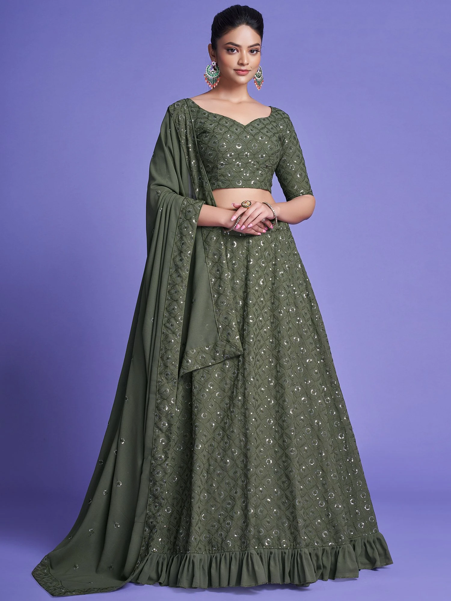 Spread your charm everywhere wearing this sage green color designer lehenga in georgette. Decorated with sequins and thread embroidered work. Paired with a embroidered choli and dupatta, both made in georgette and green color. Note: The accessories featured are purely for fashion purposes. Due to photography reasons, some color variations may occur. The semi-stitched choli and lehenga waist may be customized up to 42 inches.
