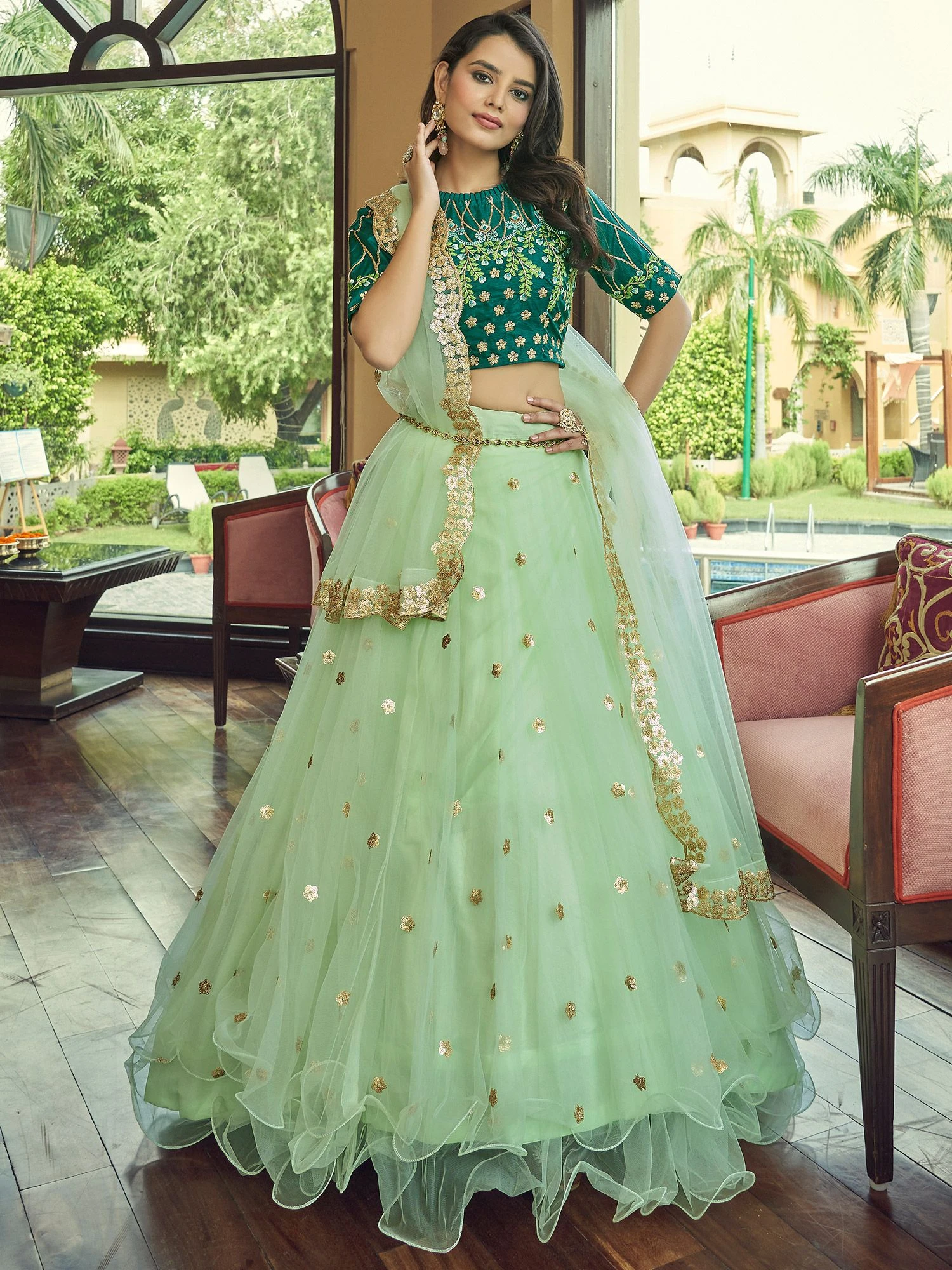 Overwhelm the audience as you wear this light green color lehenga in net. Augmented with sequins and thread embroidered work. Paired with a matching dark green color embroidered choli made in silk and dupatta, made in net. Note: The accessories featured are purely for fashion purposes. Due to photography reasons, some color variations may occur.
