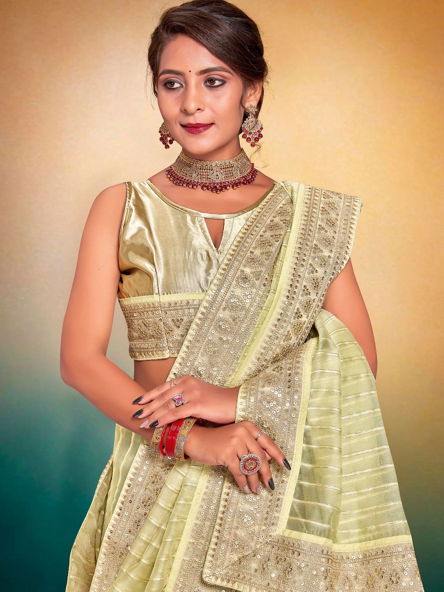 Evoke the diva in you wearing this pista green color saree crafted in silk. Enhanced using sequins and zari work. Comes with a matching green color blouse in silk. Note: The accessories featured are purely for fashion purposes. Due to photography reasons, some color variations may occur. The un-stitched blouse may be customized up to 42 inches.