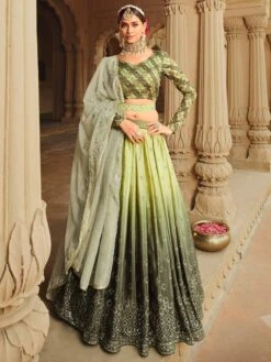 Embrace the grace of you as you wear this green and grey shaded designer lehenga in silk. Crafted with detailed sequins and thread embroidered work. Comes along with a matching green color choli in silk and a green embroidered net dupatta, both embellished in similar work. Please keep in mind that the accessories featured are purely for fashion purposes. Due to photography reasons, some color variations may occur. The semi-stitched choli and lehenga waist may be customized up to 42 inches.