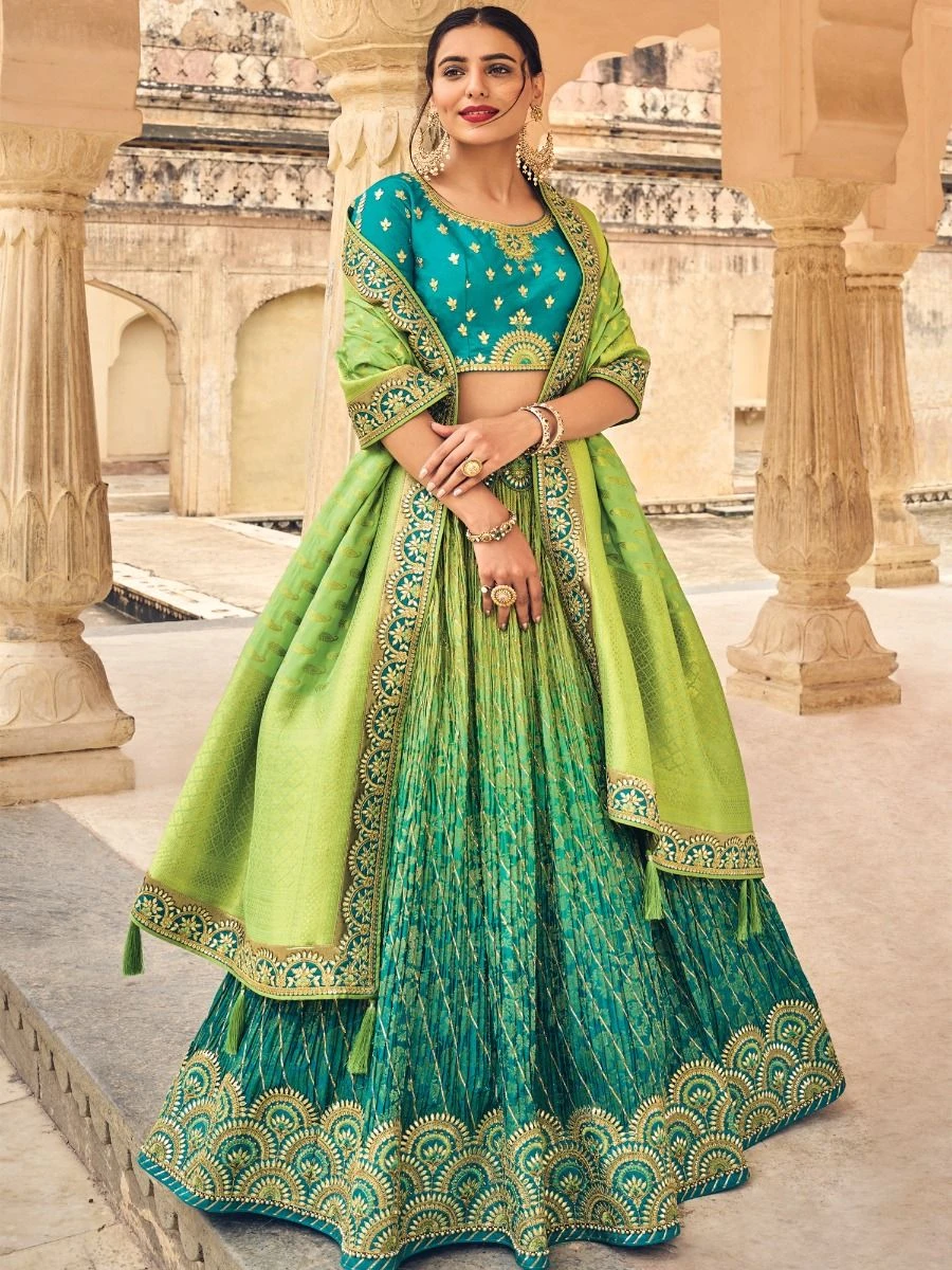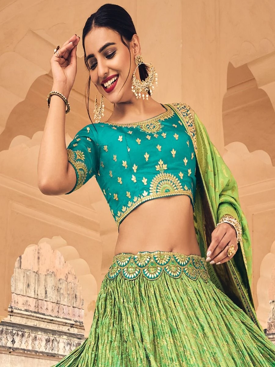 The beginning of forever looks stunningly beautiful having this fern green shaded color designer lehenga in banarasi silk. Elevated with sequins, stone and zari weaving with thread work embroidered work. Comes with a matching sapphire blue color embroidered choli in raw silk and green color dupatta, made in banarasi silk. Note: The accessories featured are purely for fashion purposes. Due to photography reasons, some color variations may occur. The semi-stitched choli and lehenga waist may be customized up to 42 inches.