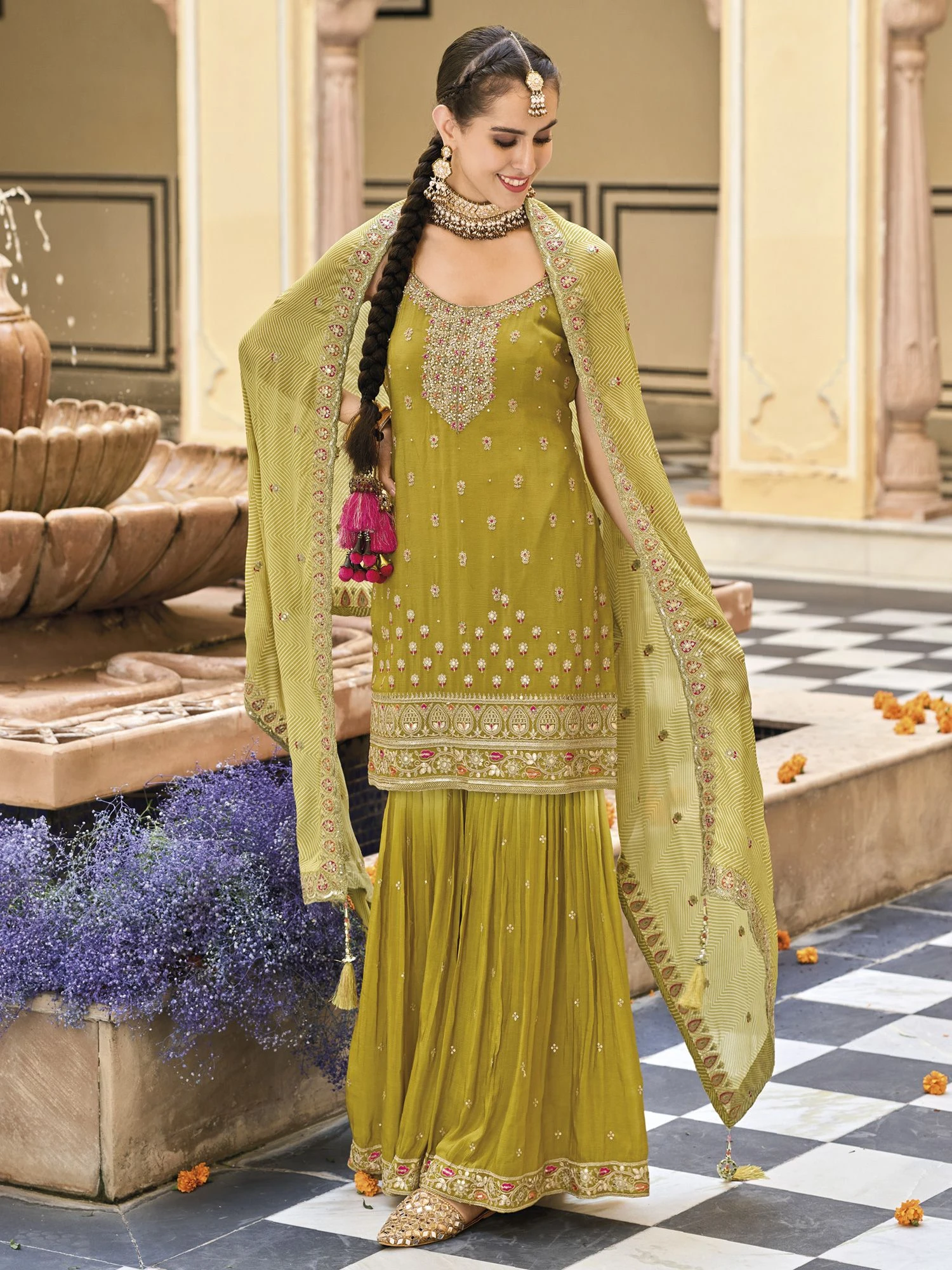 Exude major dreamy vibes with this olive green color straight cut kameez in chinon. Designed using sequins, printed and zari work embroidery all over. Paired with a chinon dupatta and a sharara style bottom, both made in green color. Note: Accessories shown are for styling purpose only. Slight color variation may occur due to photographic reasons. The semi-stitched kameez can be customised upto 42 inches.