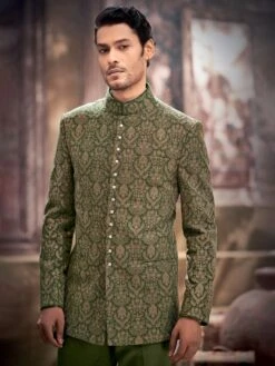 Make a lasting impression wearing this green color jodhpuri suit made in silk. Designed with a embroidered work and buttoned up front. Assembled with a matching green trousers in silk. Note: Some color variations may occur owing to photography causes. Up to 1 inch of measurement fluctuation is possible.