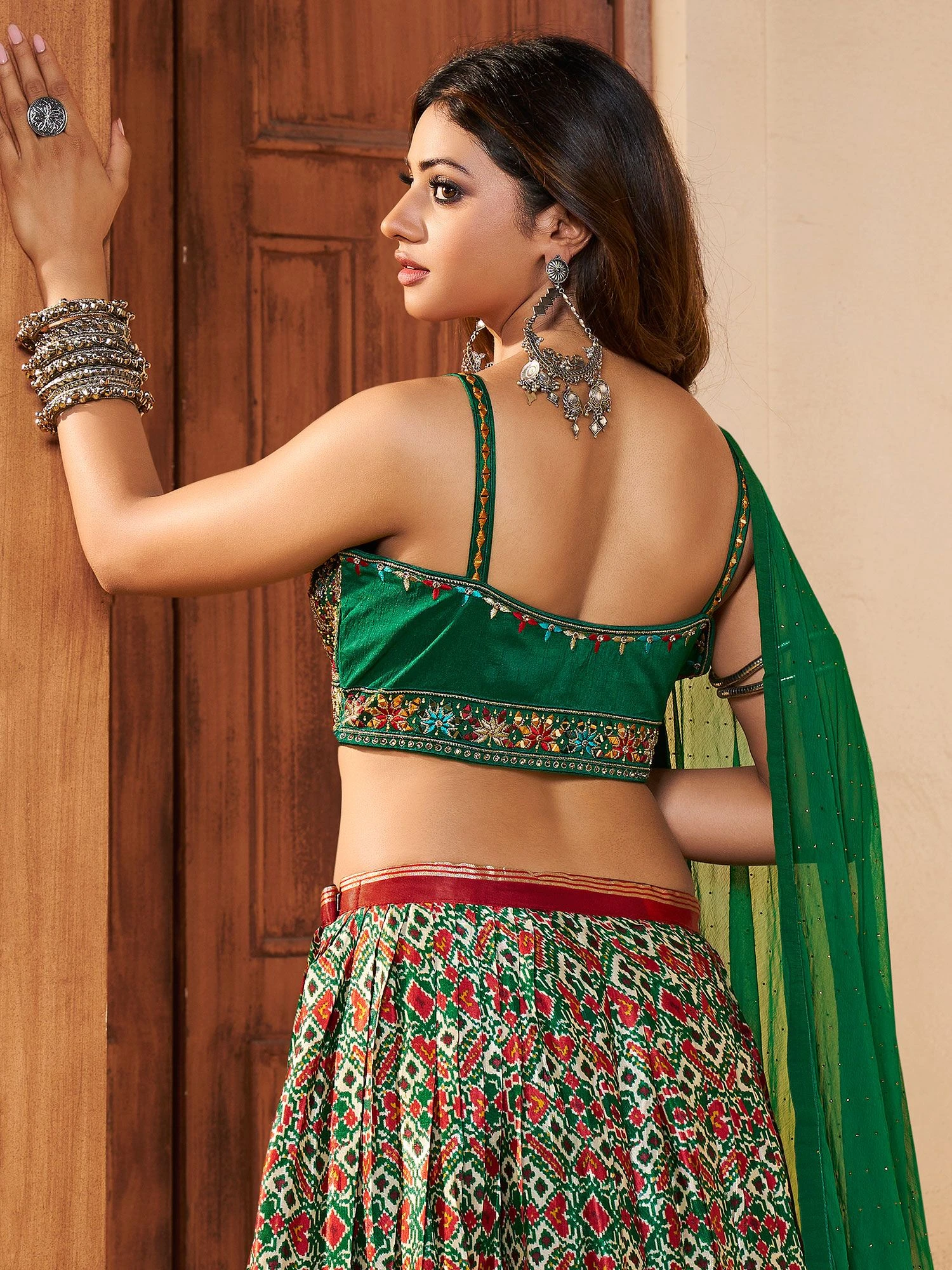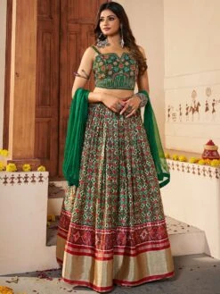 Command attention with your grace wearing this green colored silk lehenga. Furnished with prints all over, thread, hand work and mirror work embroidery all over. Assembled along with a silk choli with heavy embroidery and a georgette dupatta, both in matching green color. The semi stitched choli can be customized up to 42 inches. Note: The accessories featured are purely for fashion purposes. Due to photography reasons, some color variations may occur. The semi-stitched choli and lehenga waist may be customized up to 42 inches.