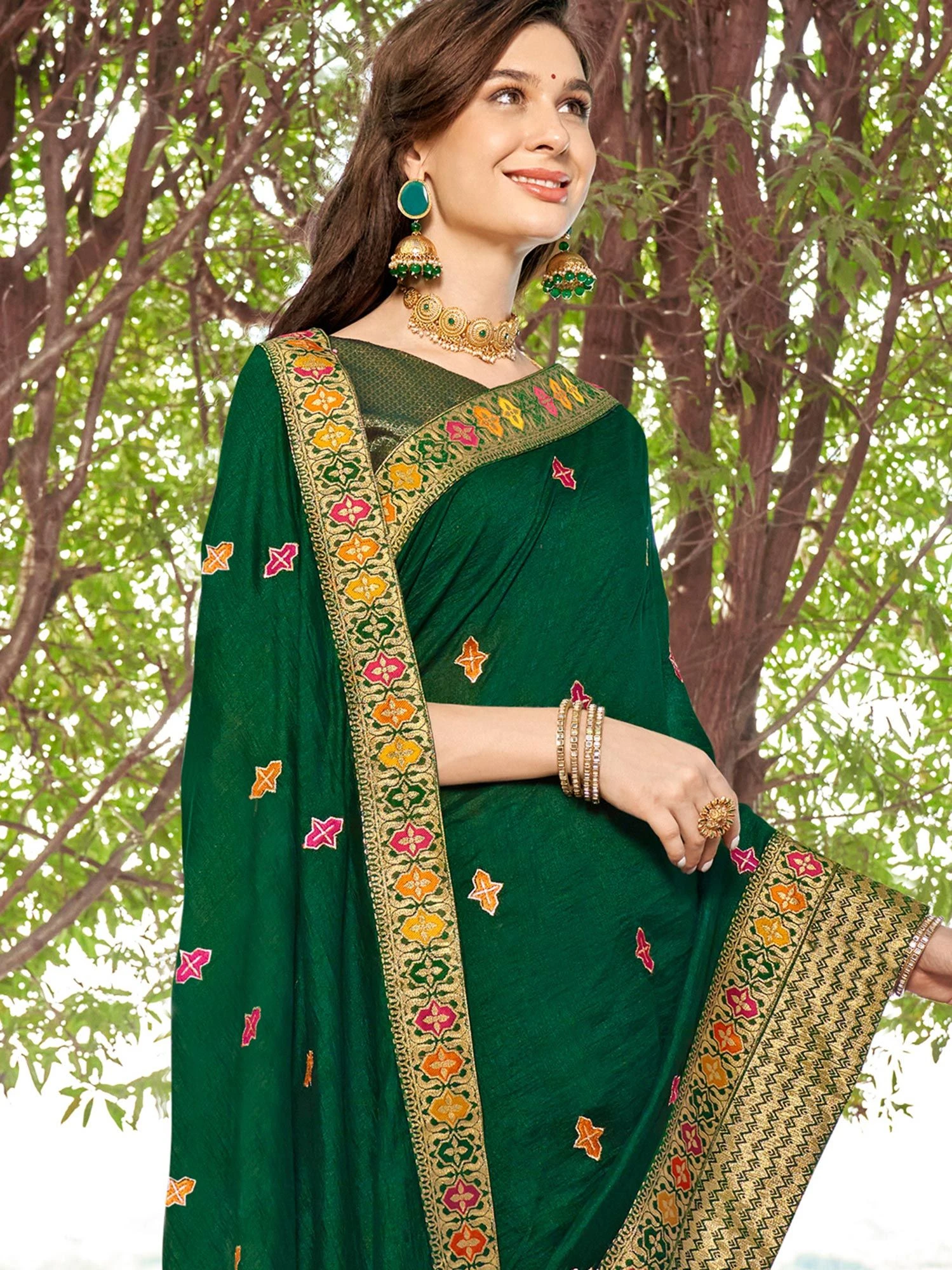 Take your festive look a notch higher wearing this green color saree crafted in art silk. Elevated using thread embroidery, zari woven patterns, showcasing distinstive borders. Comes with a matching green color blouse in banarasi silk. Note: The accessories featured are purely for fashion purposes. Due to photography reasons, some color variations may occur. The un-stitched blouse may be customized up to 42 inches.