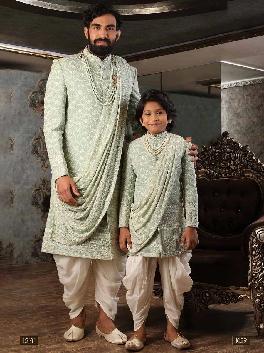 Elevate your ethnic wardrobe with this light green color sherwani made in silk. Augmented using thread embroidery with stones embellishment work. Teamed with white color dhoti pants in silk. Note: Some color variations may occur owing to photography causes. Up to 1 inch of measurement fluctuation is possible.