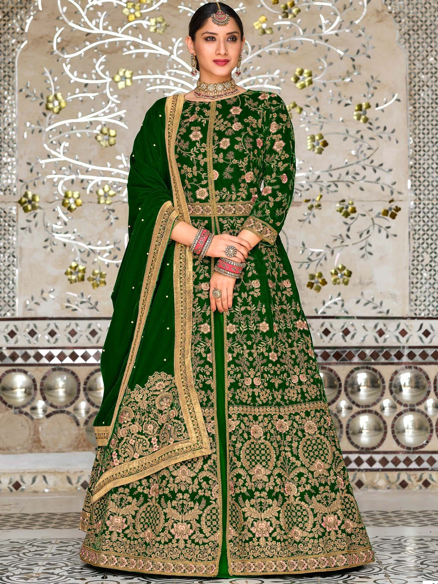 Make a lasting impression adorning this green color anarkali kameez in velvet. Designed using zari and thread work, dori embroidery with stones all over. Comes with a matching net dupatta and a matching bottom in net. Note: Accessories shown are for styling purpose only. Slight color variation may occur due to photographic reasons. The semi-stitched kameez can be customised upto 42 inches.