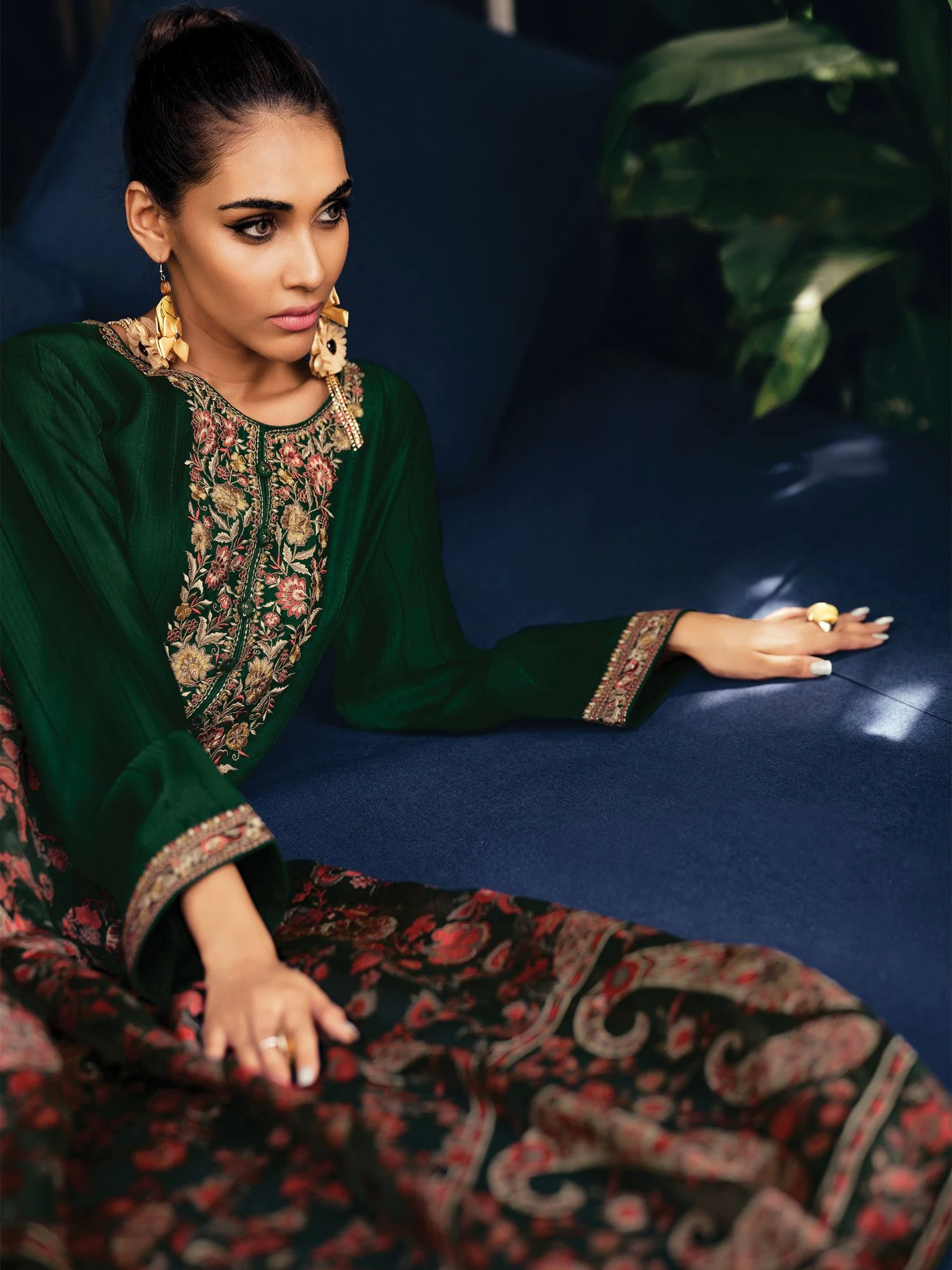Enhance yourself with this dark green color straight cut kameez in muslin. Crafted using printed with floral thread work embroidery all over. Teamed with a printed dupatta made in organza brasso and a palazzo style bottom in cotton silk, both made in green color. Note: Accessories shown are for styling purpose only. Slight color variation may occur due to photographic reasons. The semi-stitched kameez can be customised upto 42 inches.