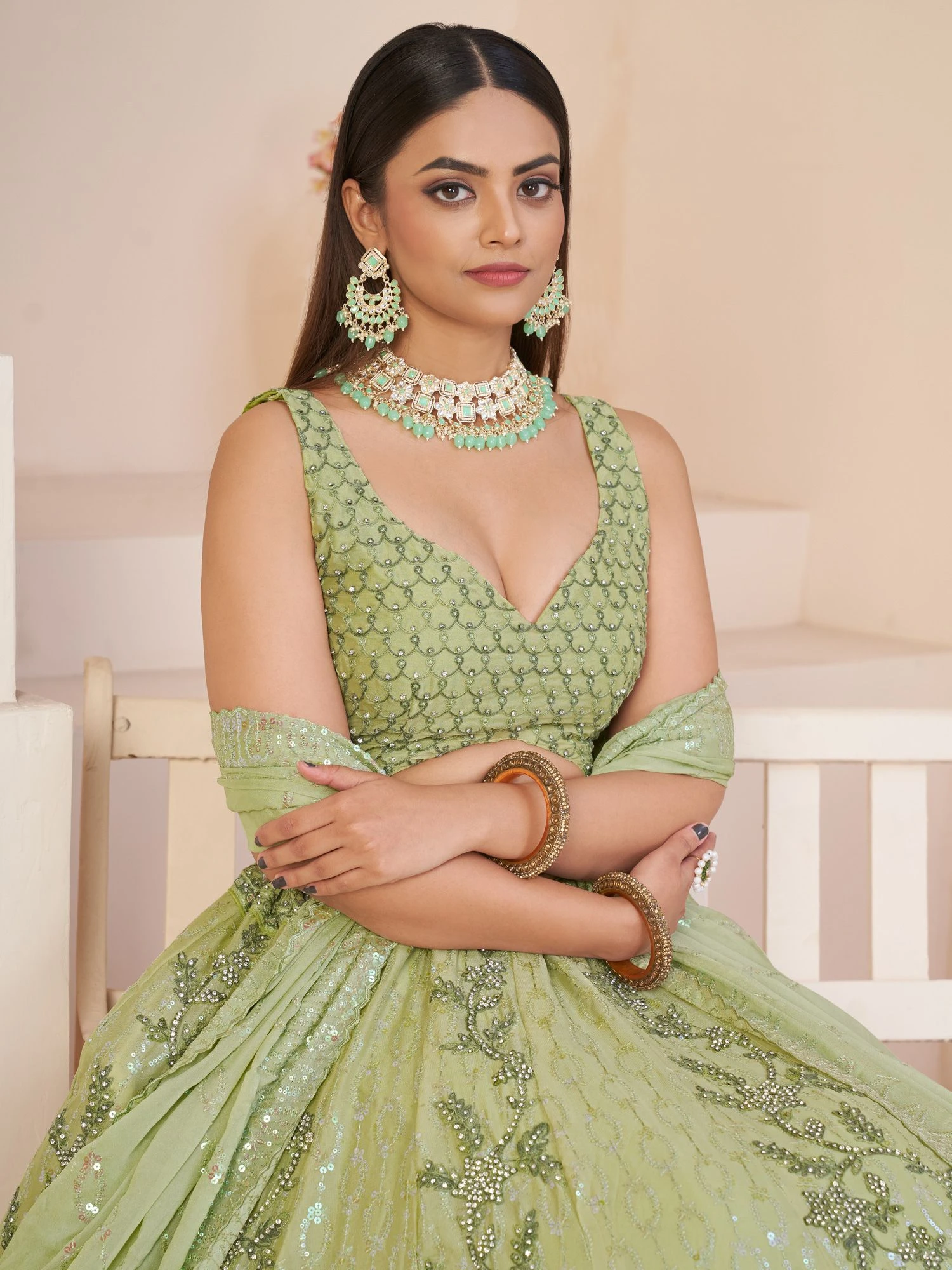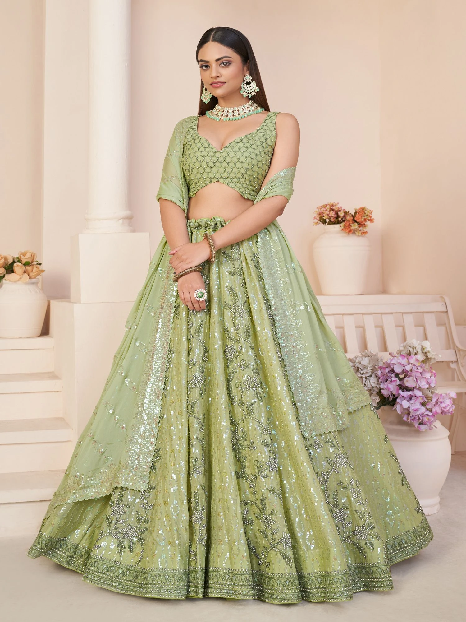 Overwhelm the audience as you wear this olive green color lehenga in georgette. Augmented with sequin, stones and floral with thread work embroidered work. Paired with a matching green color embroidered choli in georgette and green color dupatta, made in georgette. Note: The accessories featured are purely for fashion purposes. Due to photography reasons, some color variations may occur. The semi-stitched choli and lehenga waist may be customized up to 42 inches.