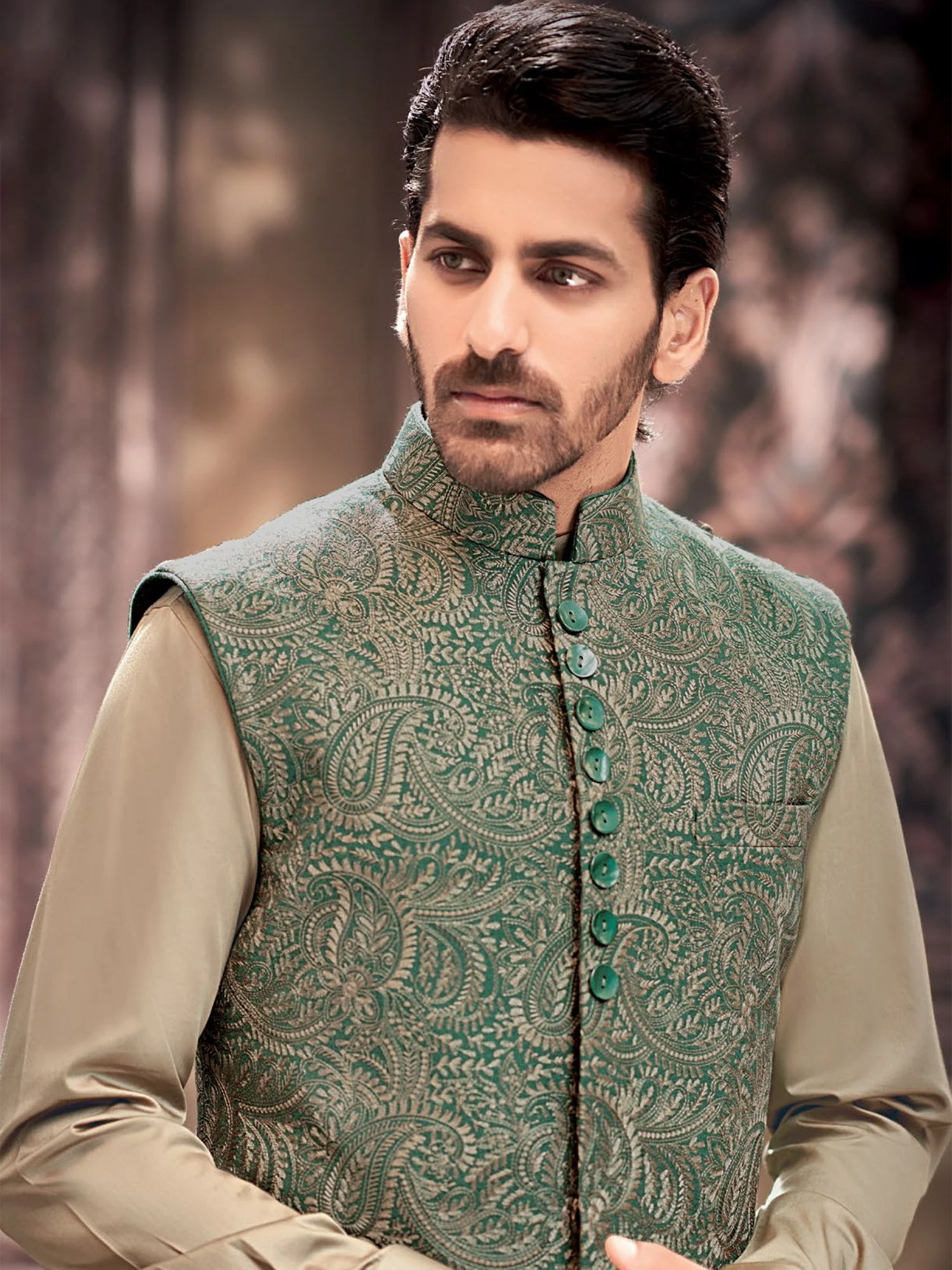 Be the centre of attention of the gala adorning this green color nehru jacket in silk. Enhanced with intricate thread embroidery all over. Cuarted using mandarin collar, buttoned up front and pockets. Note: Some color variations may occur owing to photography causes. Up to 1 inch of measurement fluctuation is possible.