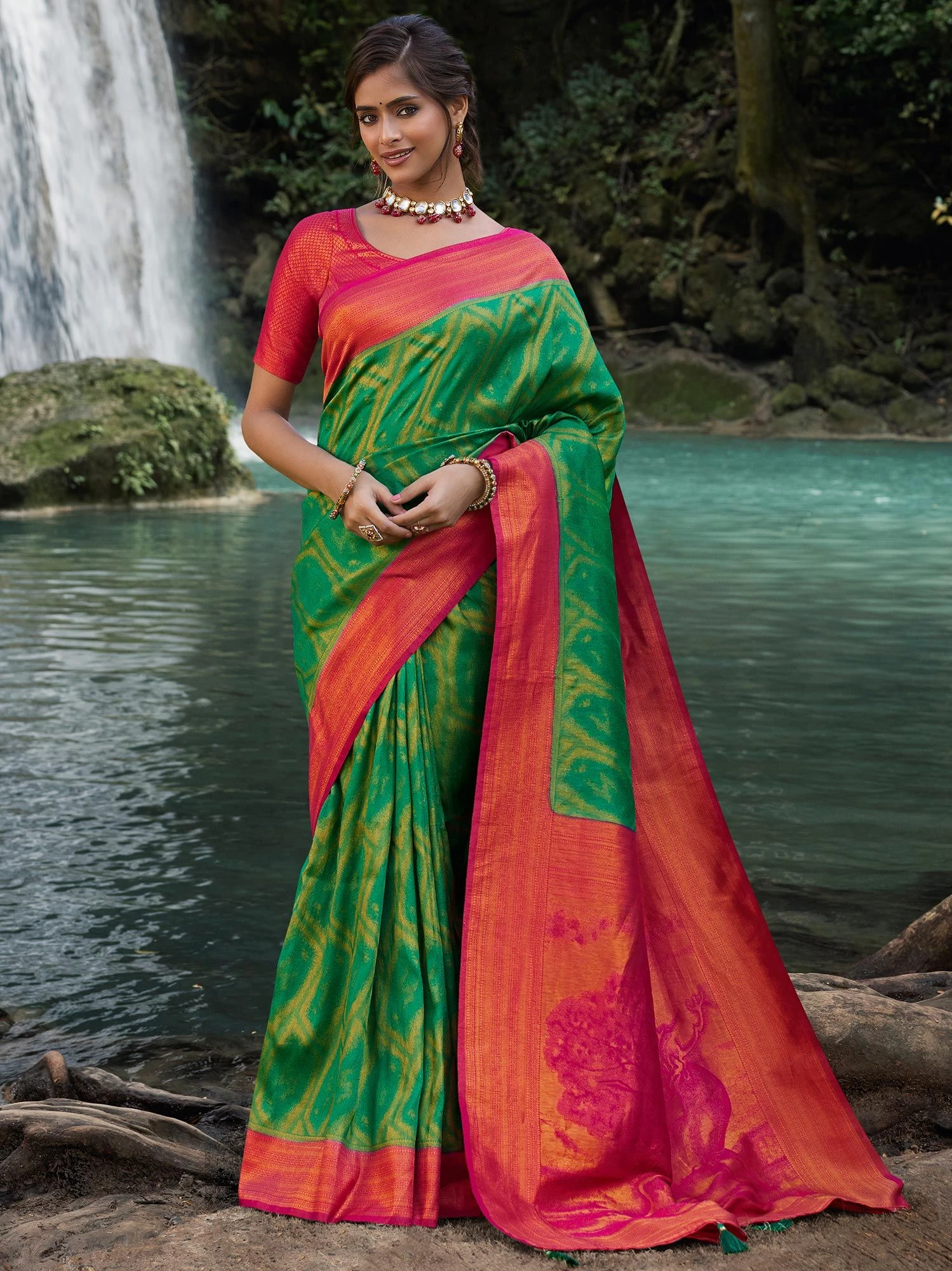 Allure the crowd wearing this jade green color saree crafted in silk. Designed with woven patterns using zari, showcasing distinstive borders and pallu. Paired with a matching pink color woven blouse in silk. Note: The accessories featured are purely for fashion purposes. Due to photography reasons, some color variations may occur. The un-stitched blouse may be customized up to 42 inches.
