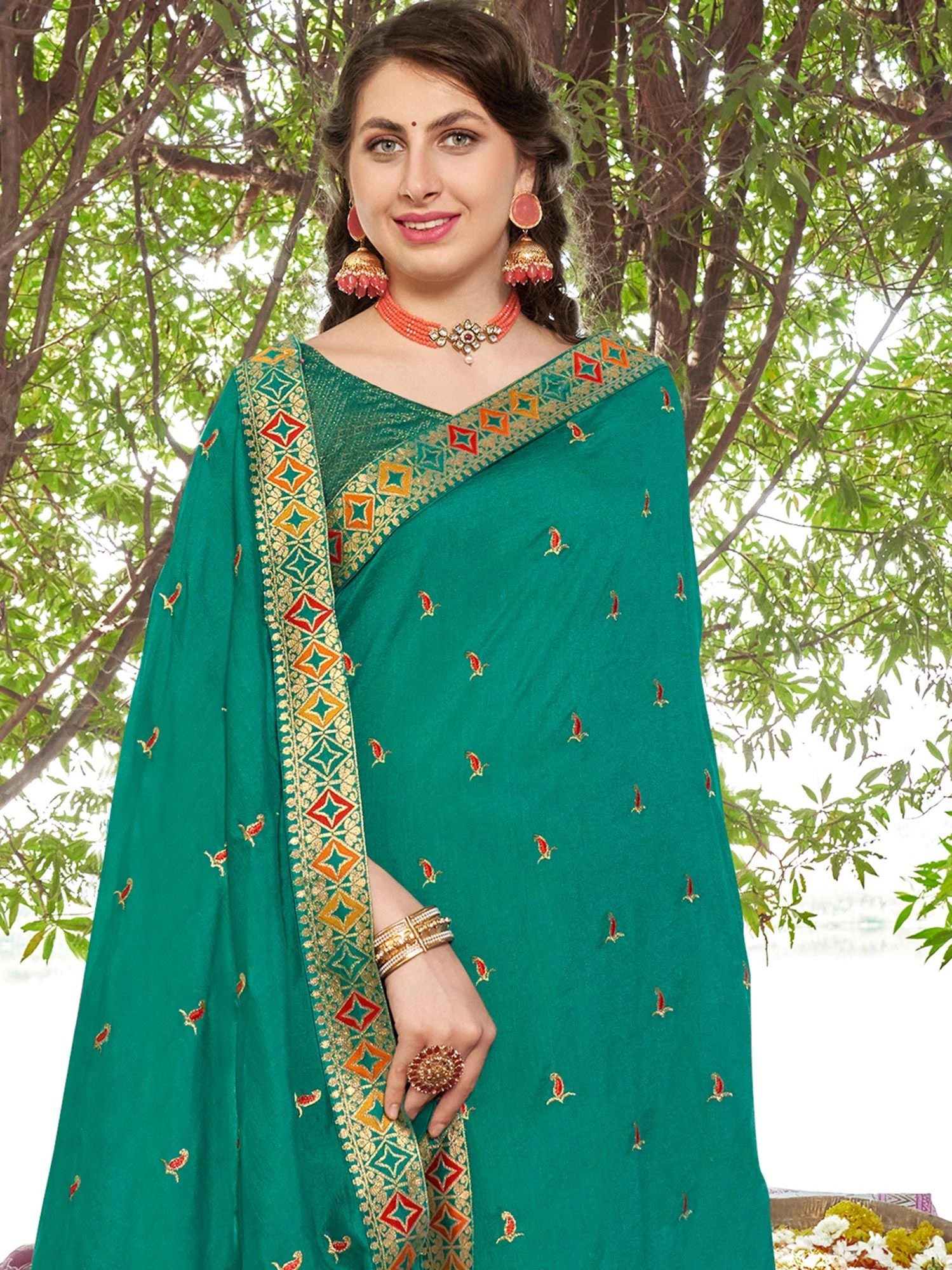 Shine no less than a dream wearing this dynasty green color saree crafted in art silk. Designed using thread embroidery, zari woven patterns, showcasing distinstive borders. Teamed with a matching green color blouse in banarasi silk. Note: The accessories featured are purely for fashion purposes. Due to photography reasons, some color variations may occur. The un-stitched blouse may be customized up to 42 inches.