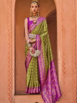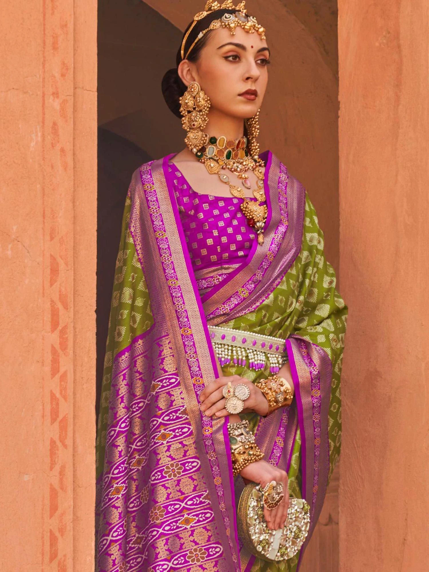 Mark the upcoming celebrations as you wear this light green color saree crafted in silk. Decorated using zari woven borders and pallu, with patola printed patterns all over. Available with a contrast matching purple color woven blouse in silk. Note: The accessories featured are purely for fashion purposes. Due to photography reasons, some color variations may occur. The un-stitched blouse may be customized up to 42 inches.