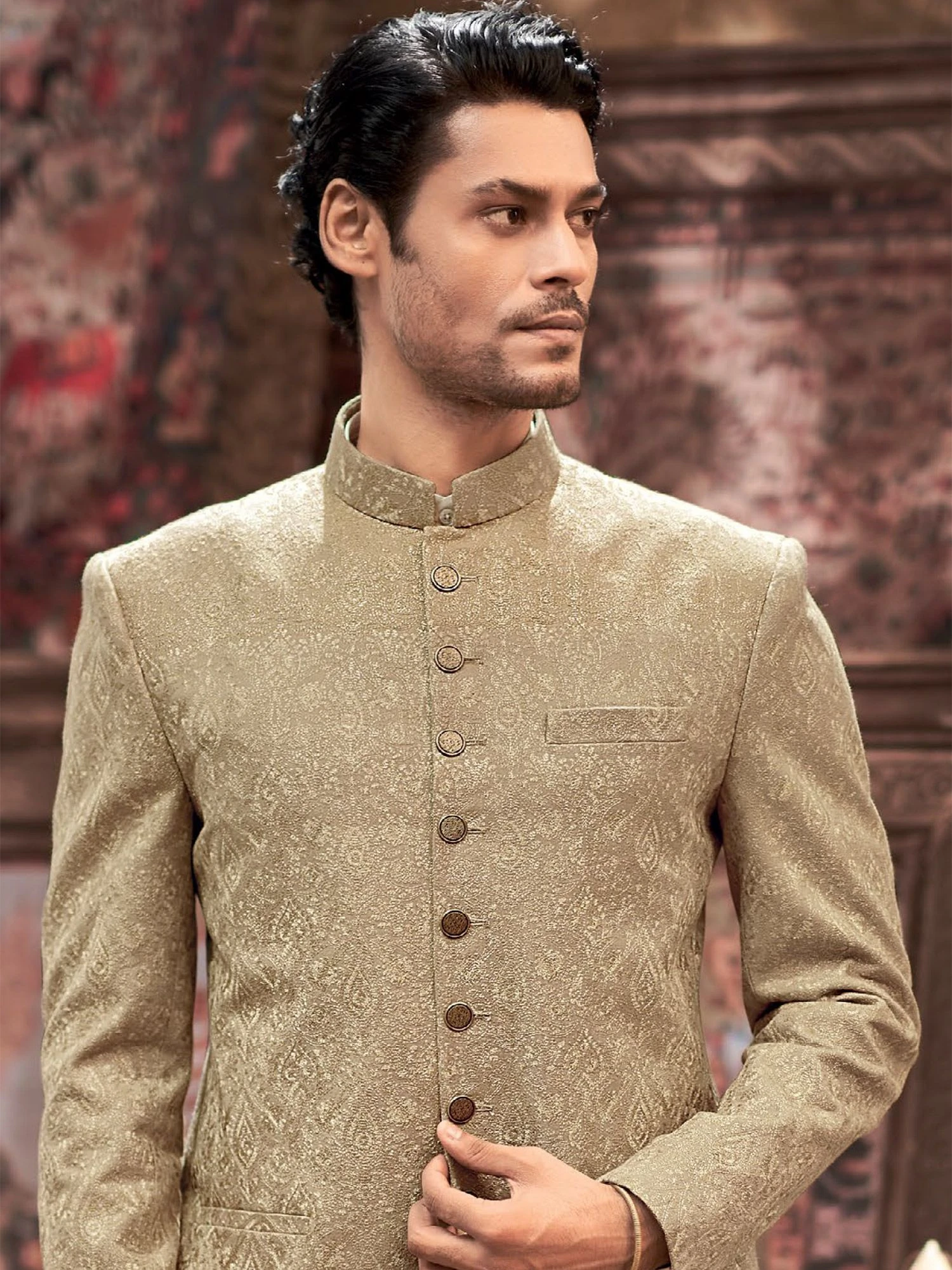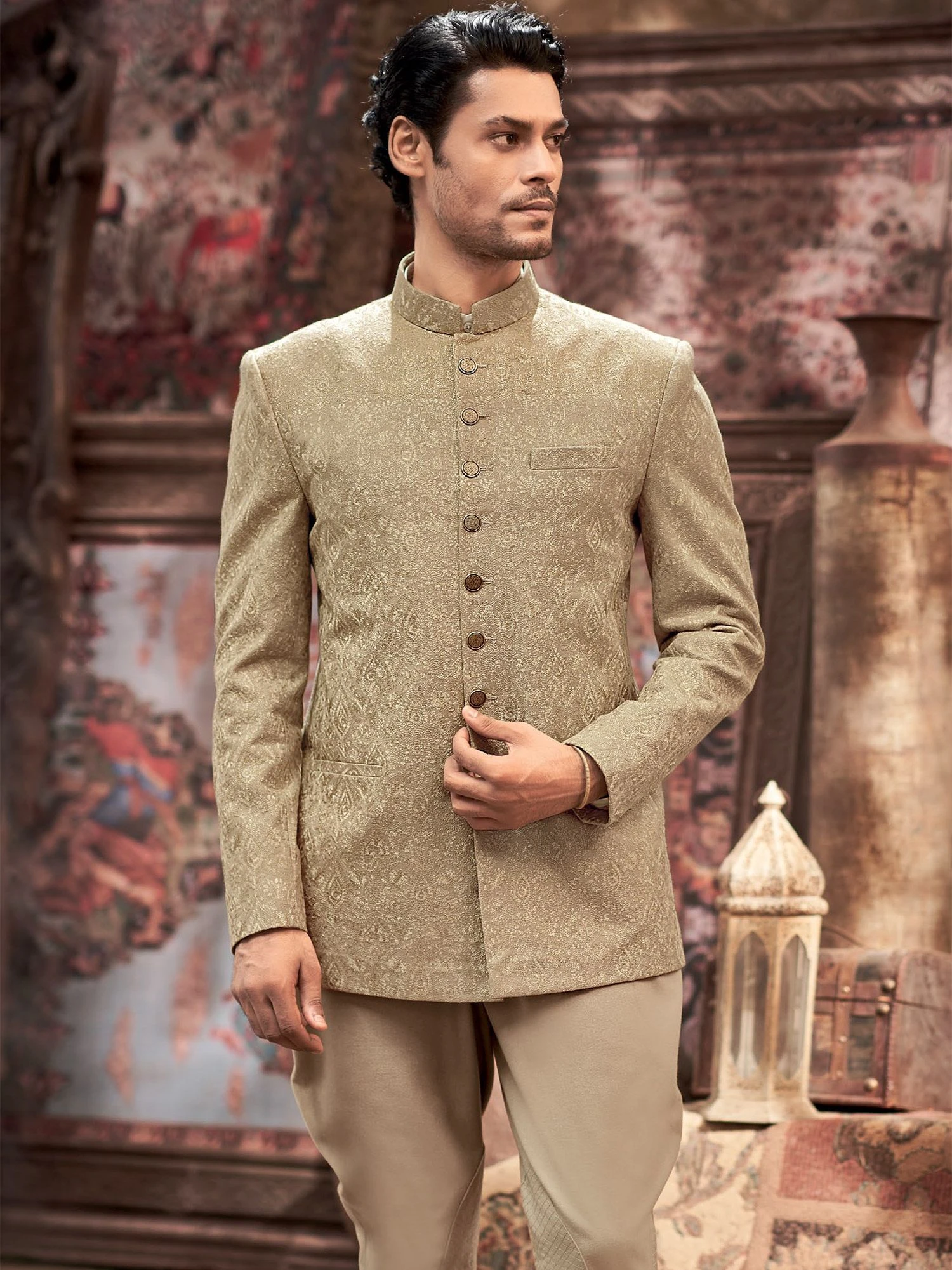 Look dapper adorning this metallic green color jodhpuri suit made in silk. Designed with a woven work. Paired with a matching beige trousers in silk. Note: Some color variations may occur owing to photography causes. Up to 1 inch of measurement fluctuation is possible.