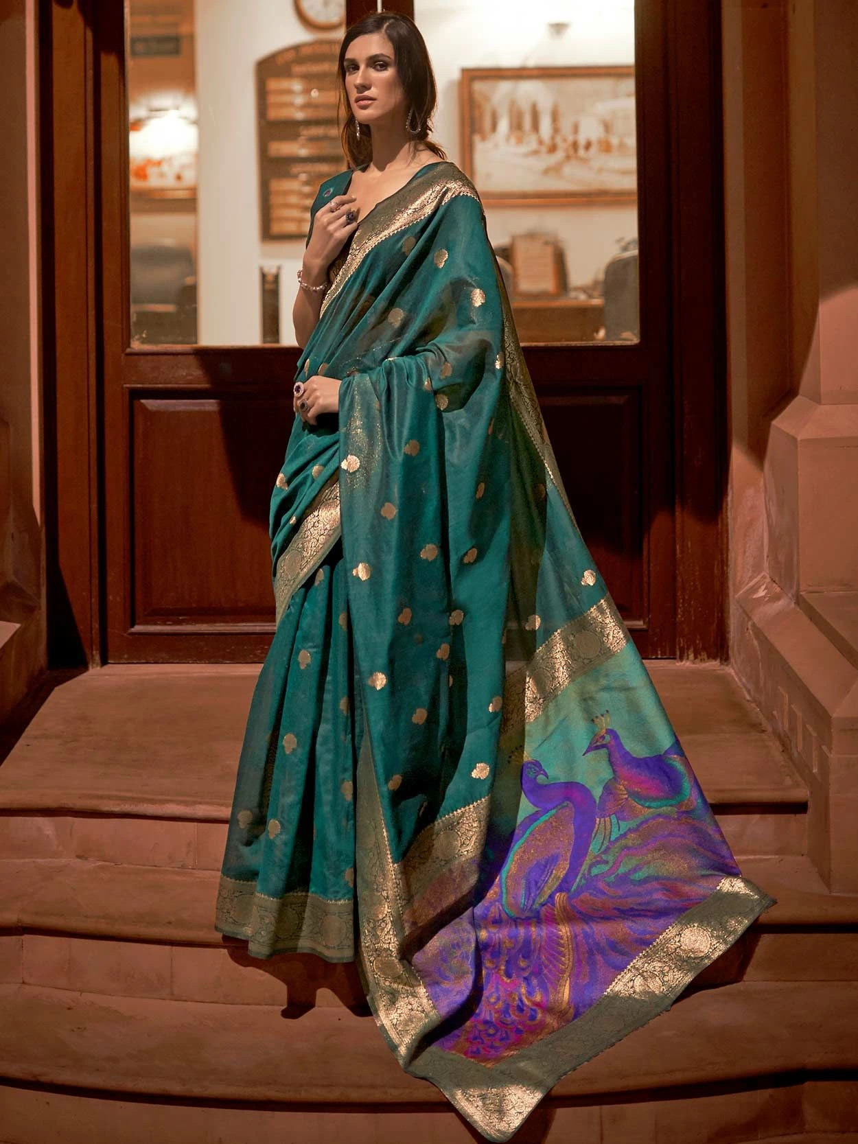 Fascinate the crowd as you wear this peacock green color traditional saree crafted in handloom silk. Decorated using traditional themed woven patterns, showcasing distinstive borders and pallu. Comes with a matching green color blouse in silk. Please keep in mind that the accessories featured are purely for fashion purposes. Due to photography reasons, some color variations may occur. The un-stitched blouse may be customized up to 42 inches.