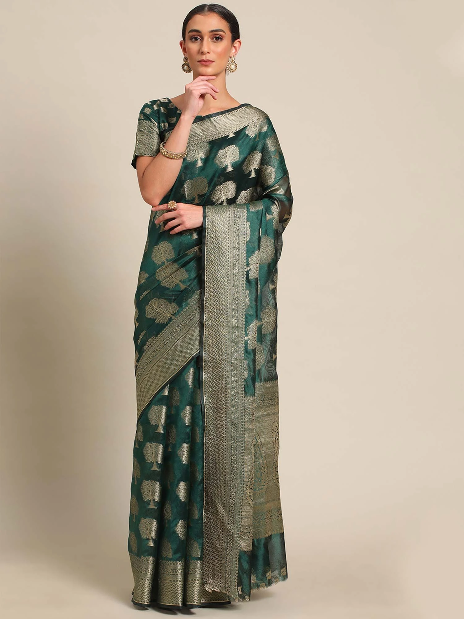 Turn on your festive mode adorning this dark green color saree crafted in organza. Enhanced using woven patterns, showcasing distinstive borders and pallu. Available with a matching green color blouse in organza. Note: The accessories featured are purely for fashion purposes. Due to photography reasons, some color variations may occur. The un-stitched blouse may be customized up to 42 inches.