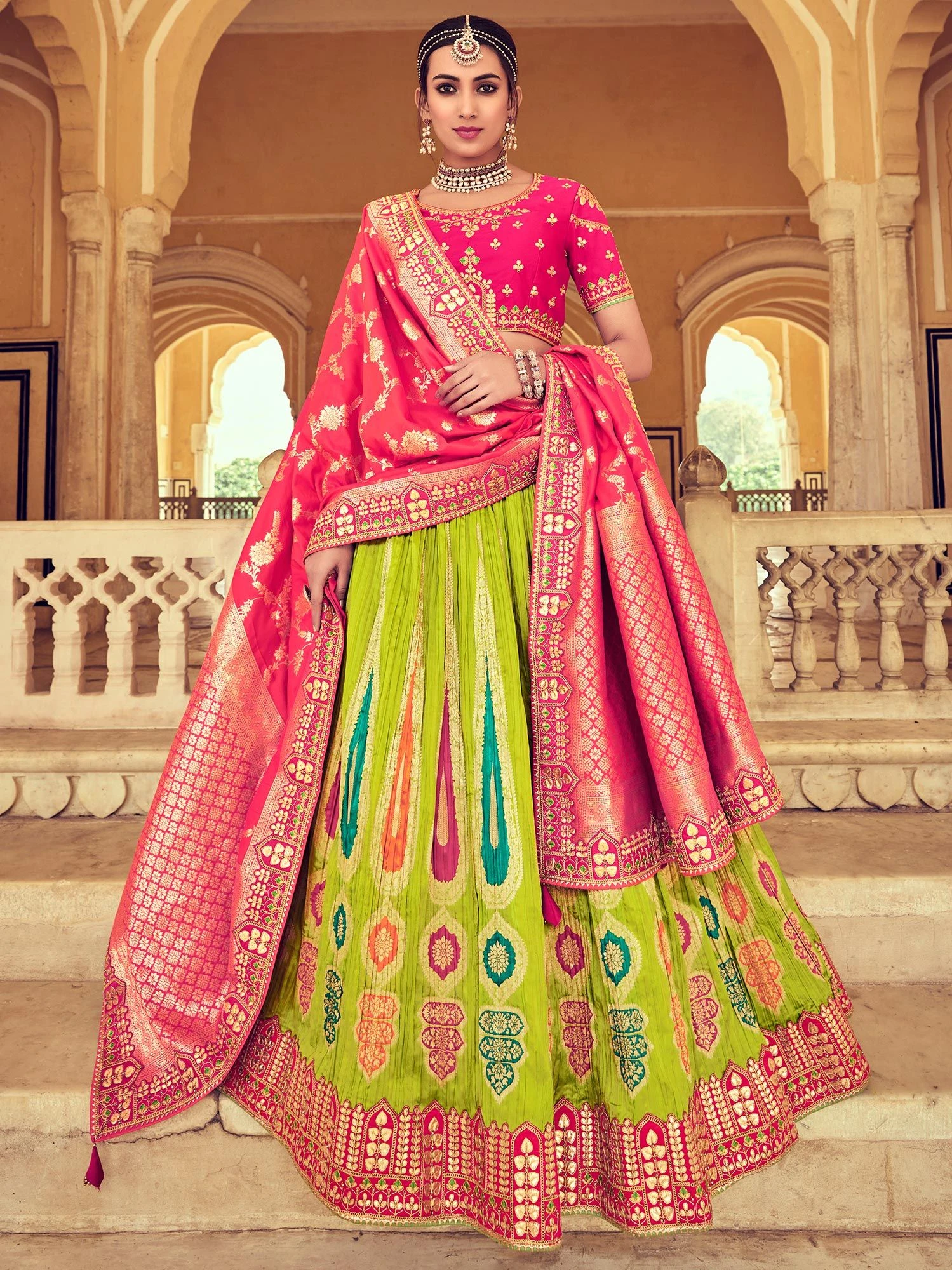 Channel a fairytale vibe wearing this parrot green color designer lehenga in silk. Decorated with zari, stones and thread embroidered work with zari weaving all over. Assembled with similarly embroidered hot pink color choli and pink dupatta, both made in silk. Note: The accessories featured are purely for fashion purposes. Due to photography reasons, some color variations may occur. The semi-stitched choli and lehenga waist may be customized up to 42 inches.