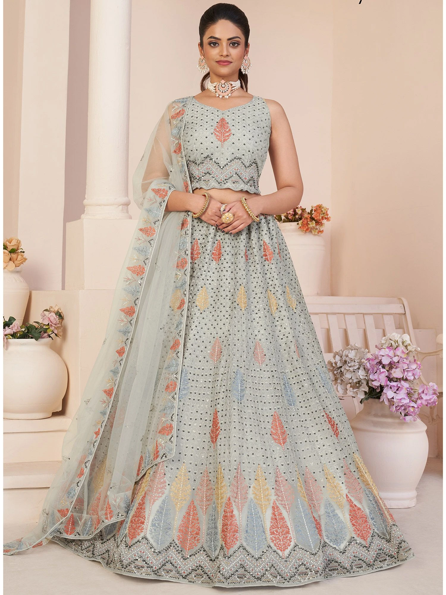 Spreading the sparking vibes with this cloud grey color lehenga in net. Augmented with sequins and thread embroidered work. Paired with a matching color embroidered choli and a dupatta, both made in net. Note: The accessories featured are purely for fashion purposes. Due to photography reasons, some color variations may occur. The semi-stitched choli and lehenga waist may be customized up to 42 inches.