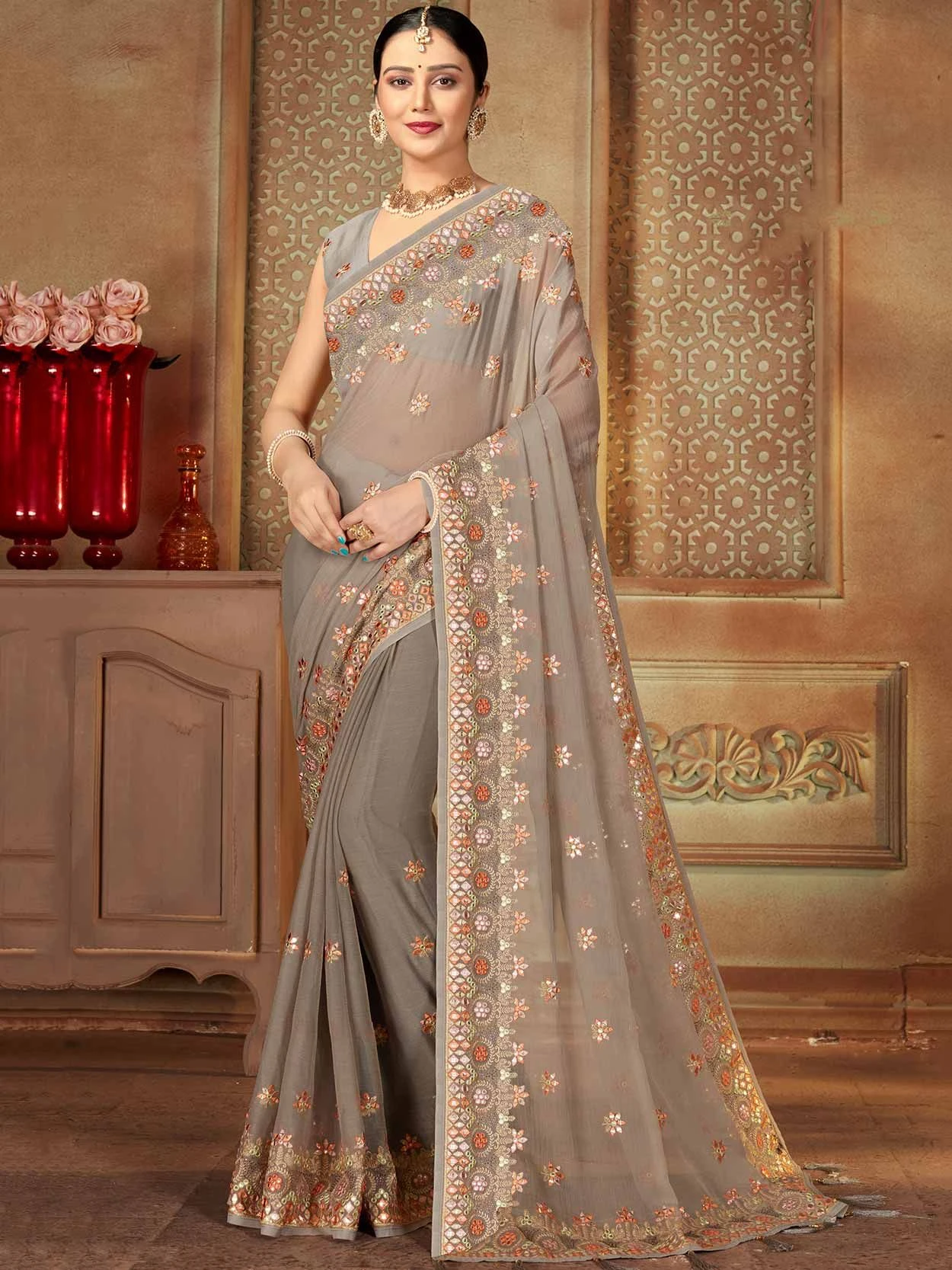 Design and style and pattern will be on the peak of your elegance once you dresses this Grey Colour Chiffon Fabric Saree. The ethnic Zari,Embroidery,Mirror,Stone work at the clothing adds a sign of attractiveness statement with your look.