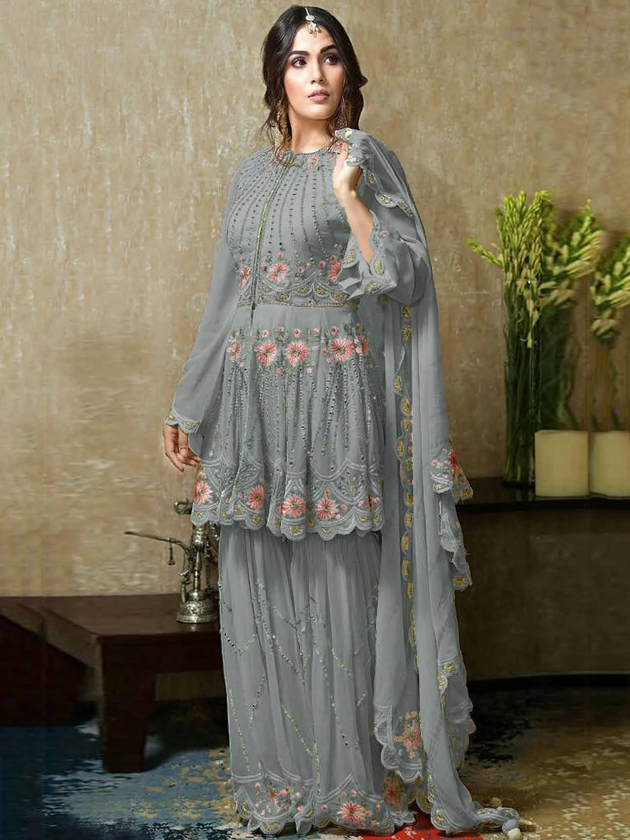 Be the sunshine of everybody’s eyes dressed in this beautiful Grey Colour Georgette Fabric Semi Stitched Salwar Kameez. The lovely Thread,Embroidery,Mirror work a substantial attribute of this attire.