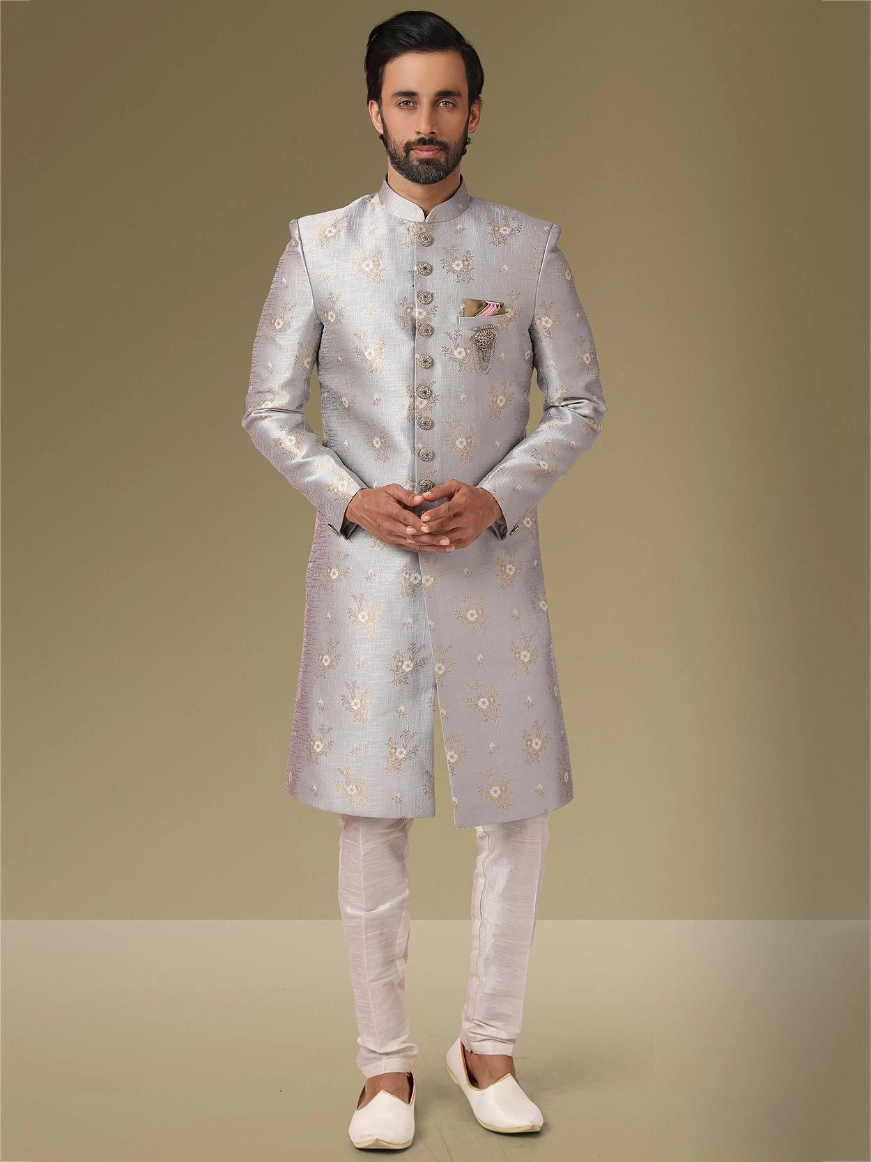 Get that irresistible blend of charm and pristine look in this Grey Colour Jacquard,Brocade Silk Fabric Men’s Indo Western. All patterns are intricately embellished with Pattern Pcs Work work.