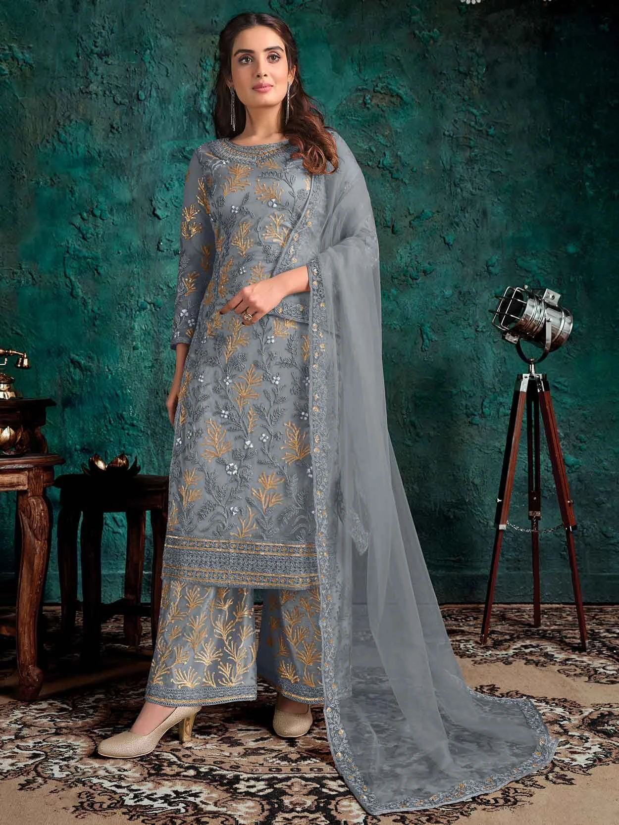 Looking great with attachment of Grey Colour Net Fabric Semi Stitched Salwar Kameez. The lovely Zari,Thread,Sequins Work work a substantial attribute of this attire.