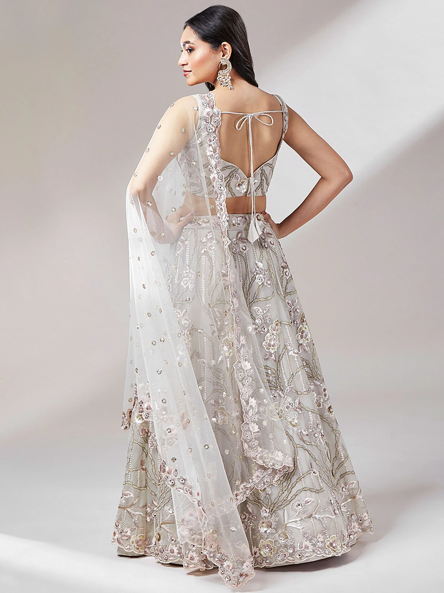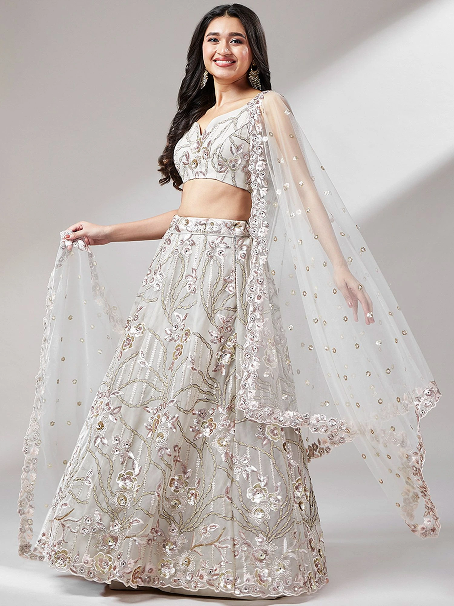 Radiate timeless grace wearing this light grey colored net lehenga. Decorated with floral themed thread, sequins and stone work embroidery all over. Assembled along with an embroidered net choli and a sequined net dupatta, both in matching color. The semi stitched choli can be customized up to 42 inches. Note: The accessories featured are purely for fashion purposes. Due to photography reasons, some color variations may occur. The semi-stitched choli and lehenga waist may be customized up to 42 inches.