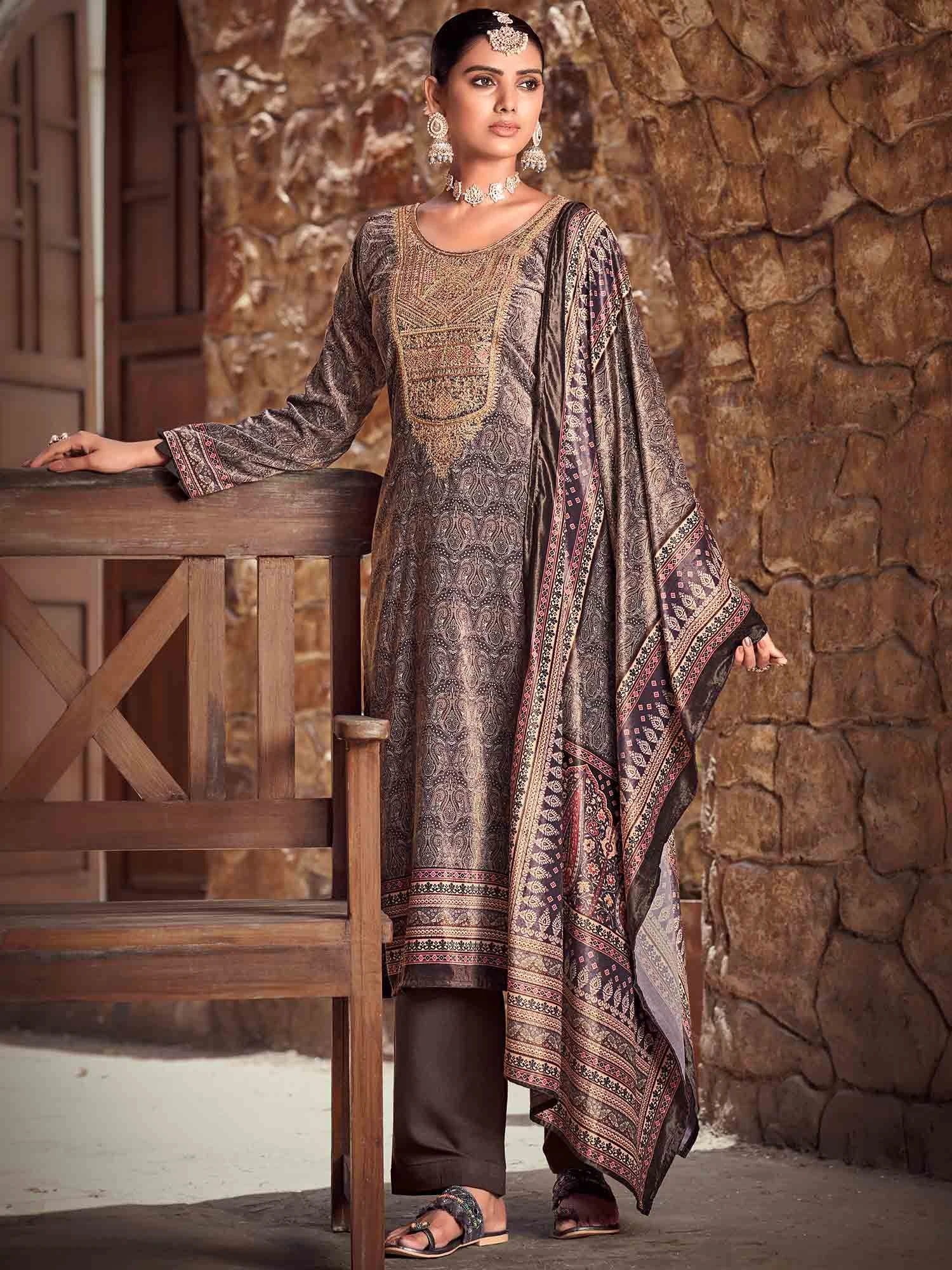 Evoke the fashionista in you wearing this grey color straight cut kameez in velvet. Decorated with dense digital prints all over and embroidered neck yoke. Assembled with matching printed pashmina pants and printed velvet dupatta. Note: Accessories shown are for styling purpose only. Slight color variation may occur due to photographic reasons. The semi-stitched kameez can be customised upto 42 inches.