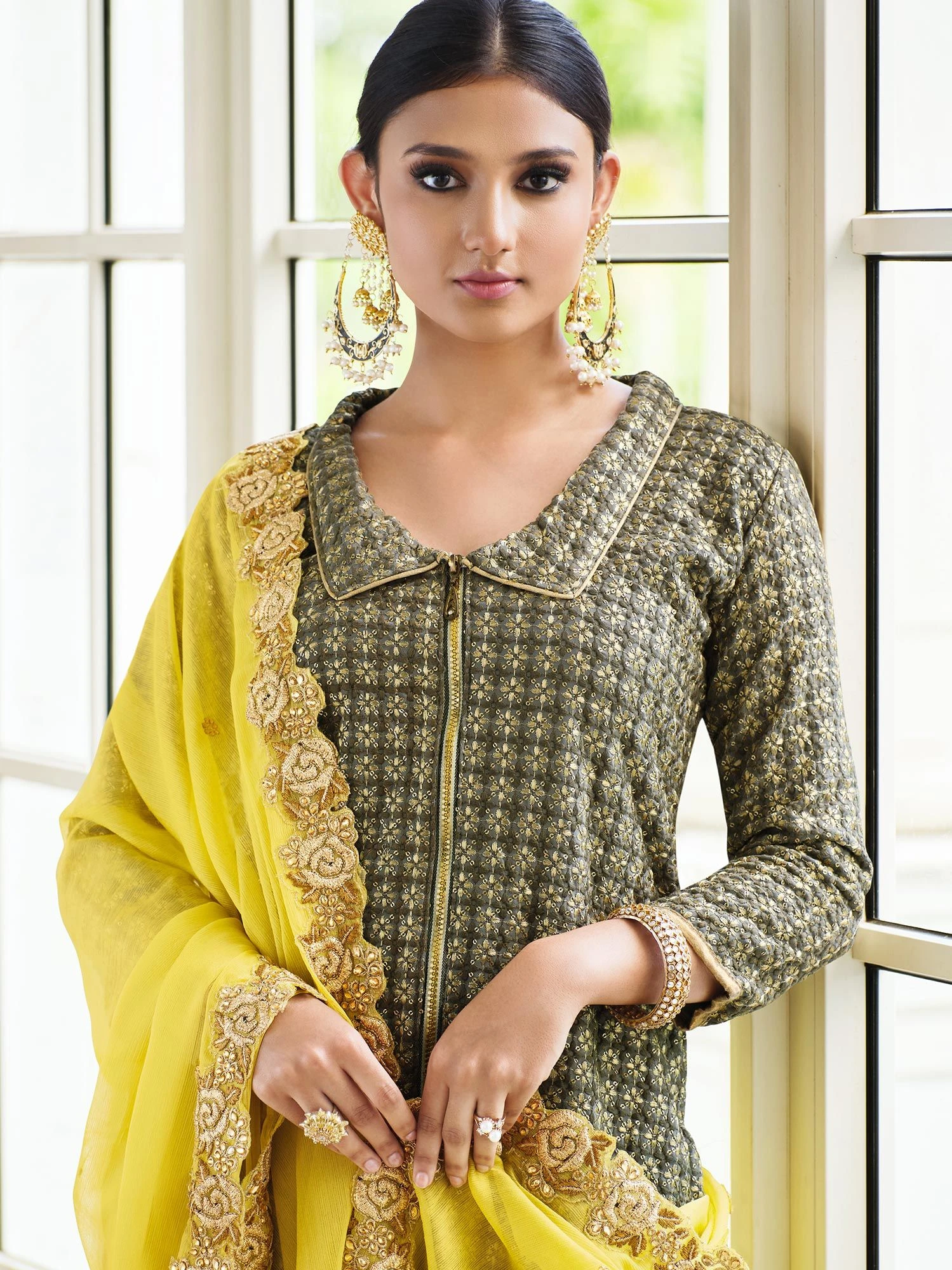 Glam up sweetly wearing this dull grey color collared kameez in georgette. Designed using thread and sequins embroidered details all over using floral themes. Assembled with a yellow color chiffon dupatta and matching pants in shantoon. Note: Accessories shown are for styling purpose only. Slight color variation may occur due to photographic reasons. The semi-stitched kameez can be customised upto 42 inches.