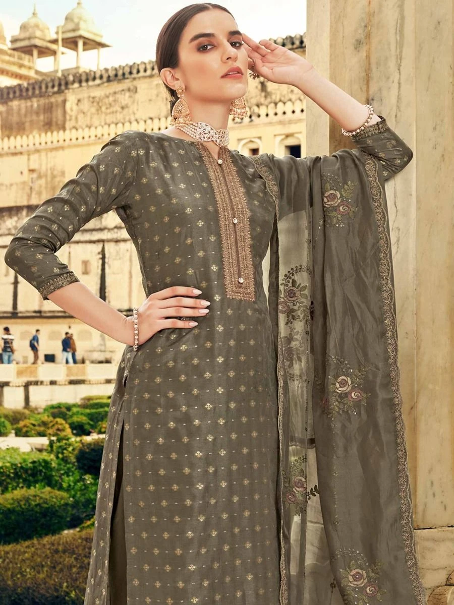 Get set to look regal sporting this grey color straight cut kameez in cotton. Augmented with thread, zari and sequins embroidery all over. Available with a matching satin pants and an embroidered dupatta in cotton. Note: Accessories shown are for styling purpose only. Slight color variation may occur due to photographic reasons. The semi-stitched kameez can be customised upto 42 inches.