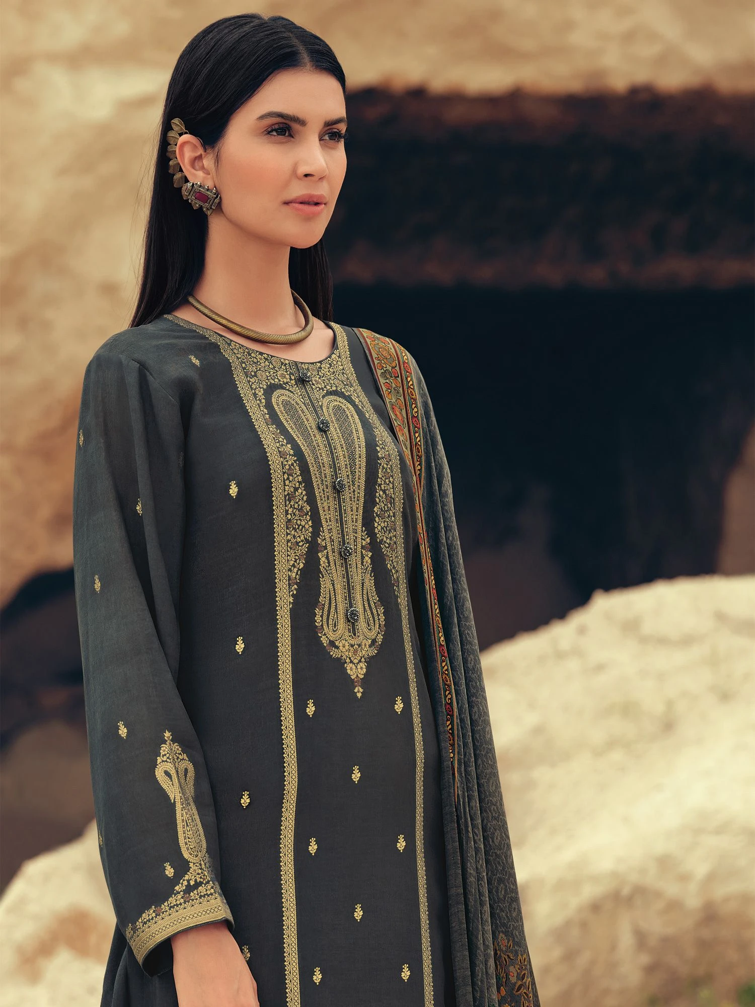 Get a squeaky clean ethnic look adorning this pebble grey color straight cut kameez in silk. Enhanced using printed and silk woven work. Assigned with a printed dupatta in silk and a palazzo style bottom, both made in grey color. Note: Accessories shown are for styling purpose only. Slight color variation may occur due to photographic reasons. The semi-stitched kameez can be customised upto 42 inches.