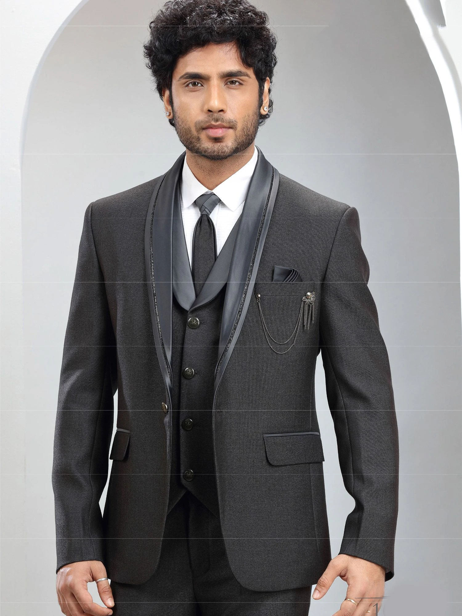 Reflect an ambiance of ethereal grace by adorning this ash grey color three piece suit made in jute textured italian fabric. Paired with a white cotton shirt, tie and a matching grey color pant. Note: Some color variations may occur owing to photography causes. Up to 1 inch of measurement fluctuation is possible.