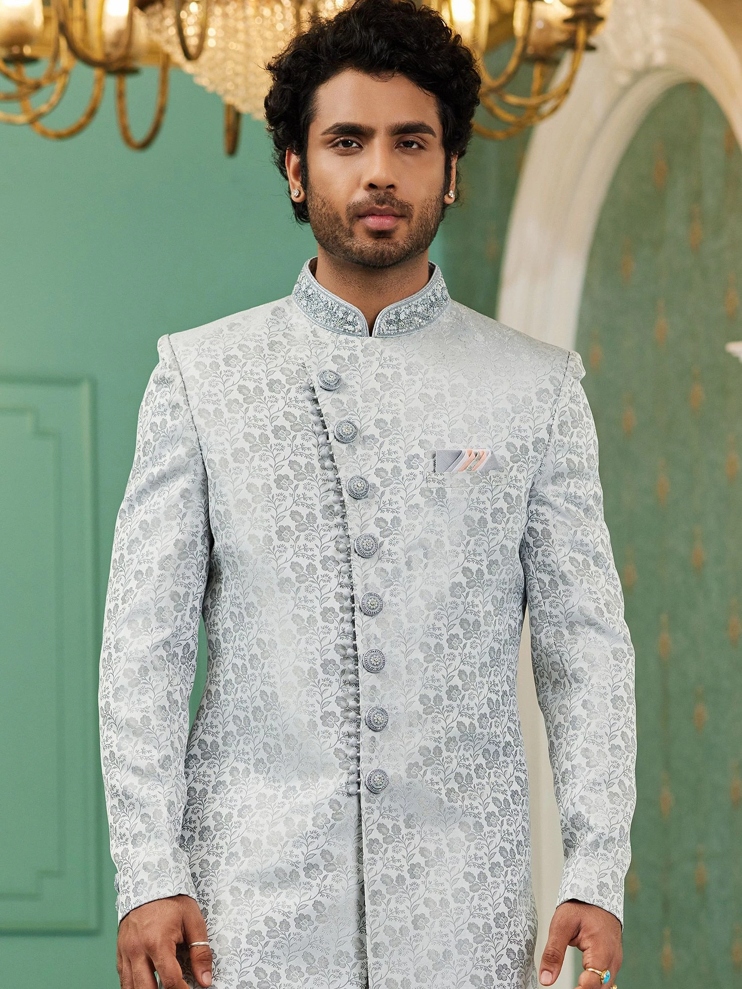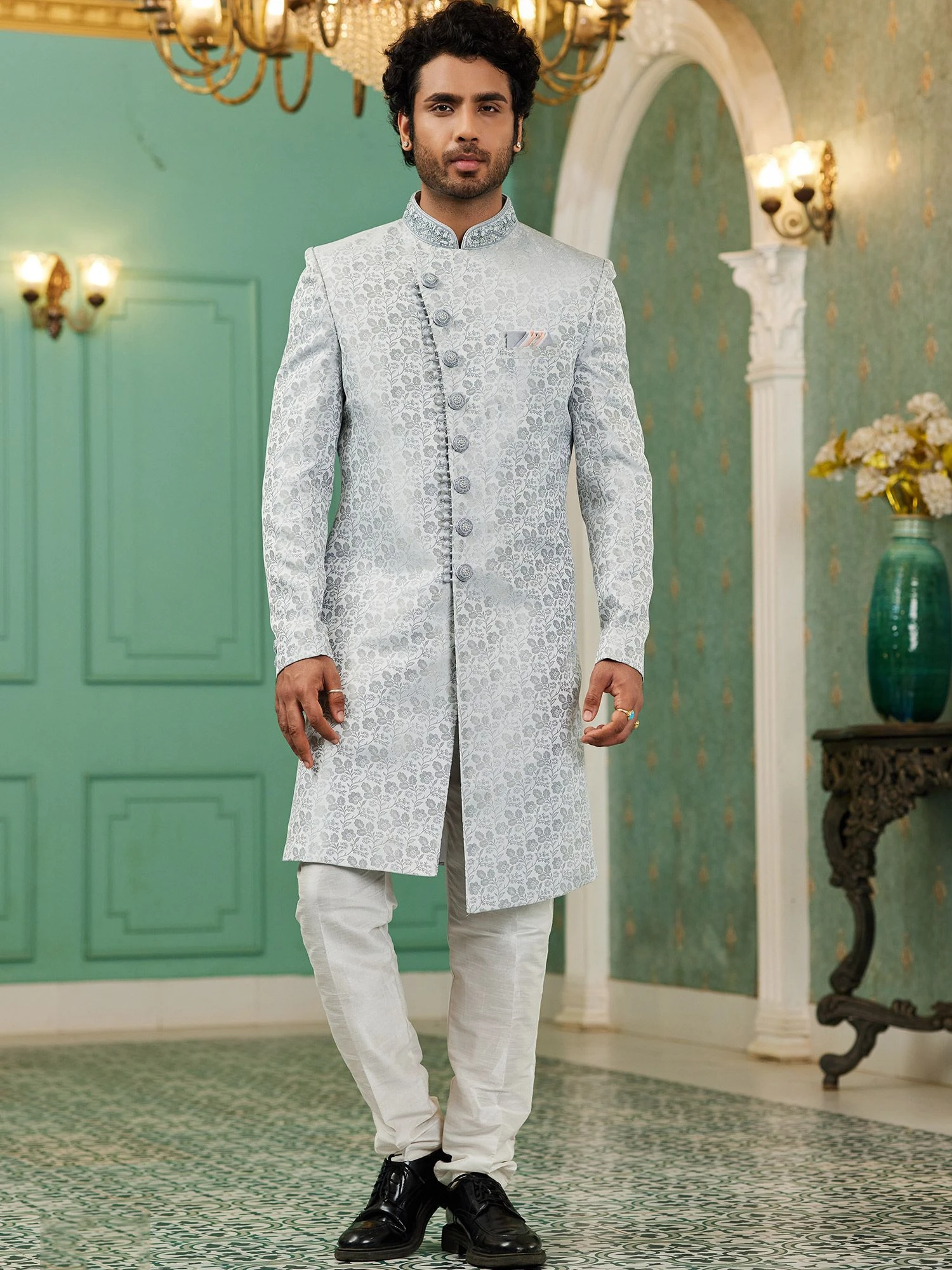 Create symbol of timeless grace and elegance adorning this grey color sherwani fabricated in jacquard. Designed using weaving embroidery work. Paired with white color churidar in dupion silk. Note: Some color variations may occur owing to photography causes. Up to 1 inch of measurement fluctuation is possible.
